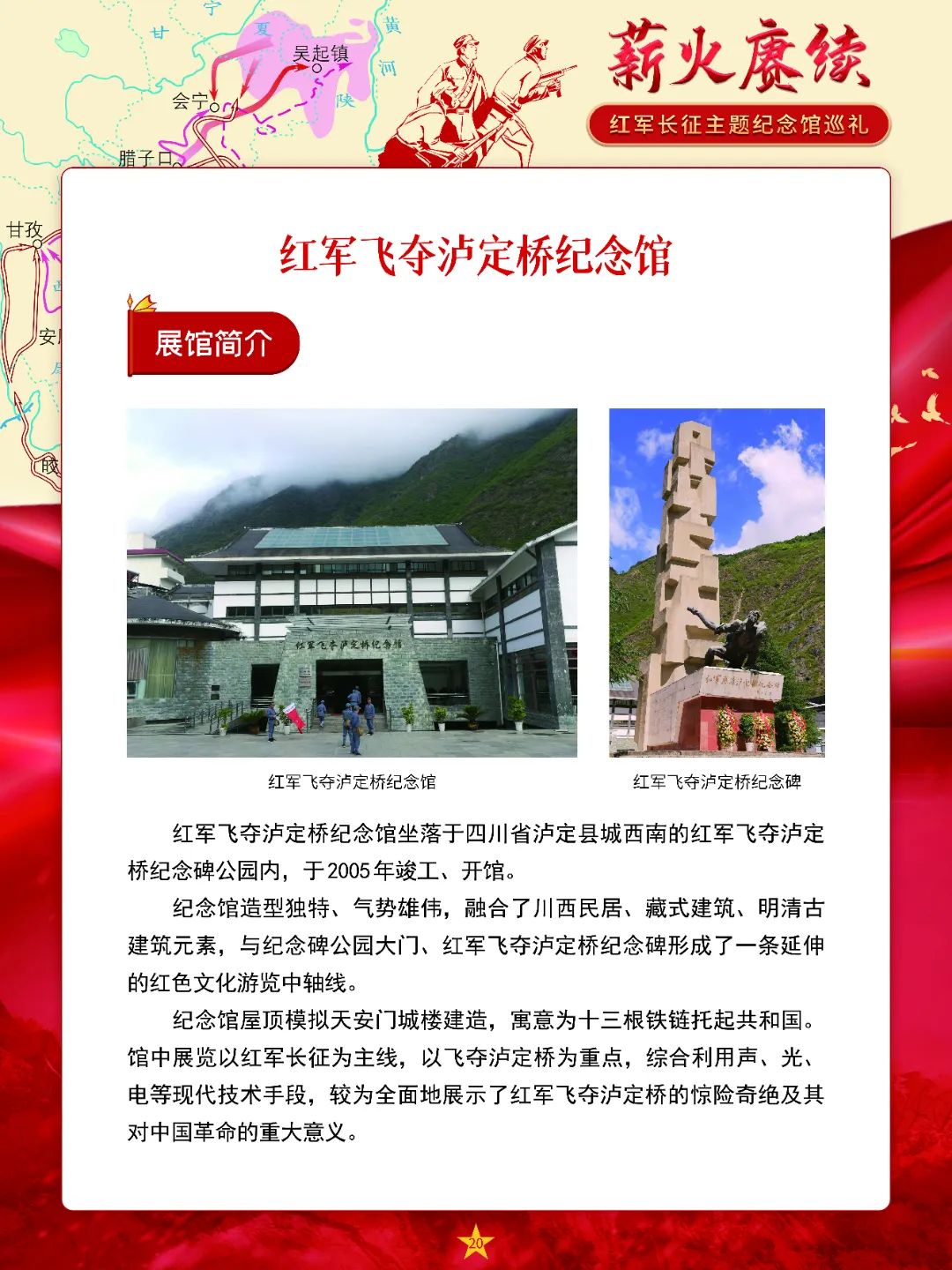 “红军不怕远征难,万水千山只等闲。”长征,是中国工农红军在中国共产党的领导下,以不畏艰险、前仆后继的英雄气概谱写的团结战斗的光辉史诗,是中国革命史上的奇迹。英雄的红军在长征途中血战湘江,四渡赤水,巧渡金沙江,强渡大渡河,飞夺泸定桥,征服空气稀薄的冰山雪岭,穿越渺无人烟的沼泽草地,纵横十余省,长驱二万五千里,谱写了一曲曲英勇、雄壮的英雄赞歌,留下了大量极其珍贵的红色文化遗产。革命先烈在长征中留下的光辉足迹、历史建筑、历史遗存等红色资源,昭示着中华儿女的崇高理想和价值追求,诠释了中华民族的顽强意志。本展览将沿着红军长征的路线,带领大家走进各地的长征主题纪念馆,回首中国共产党领导人民浴血奋战的光辉历程,缅怀革命先辈,传承并弘扬伟大长征精神。