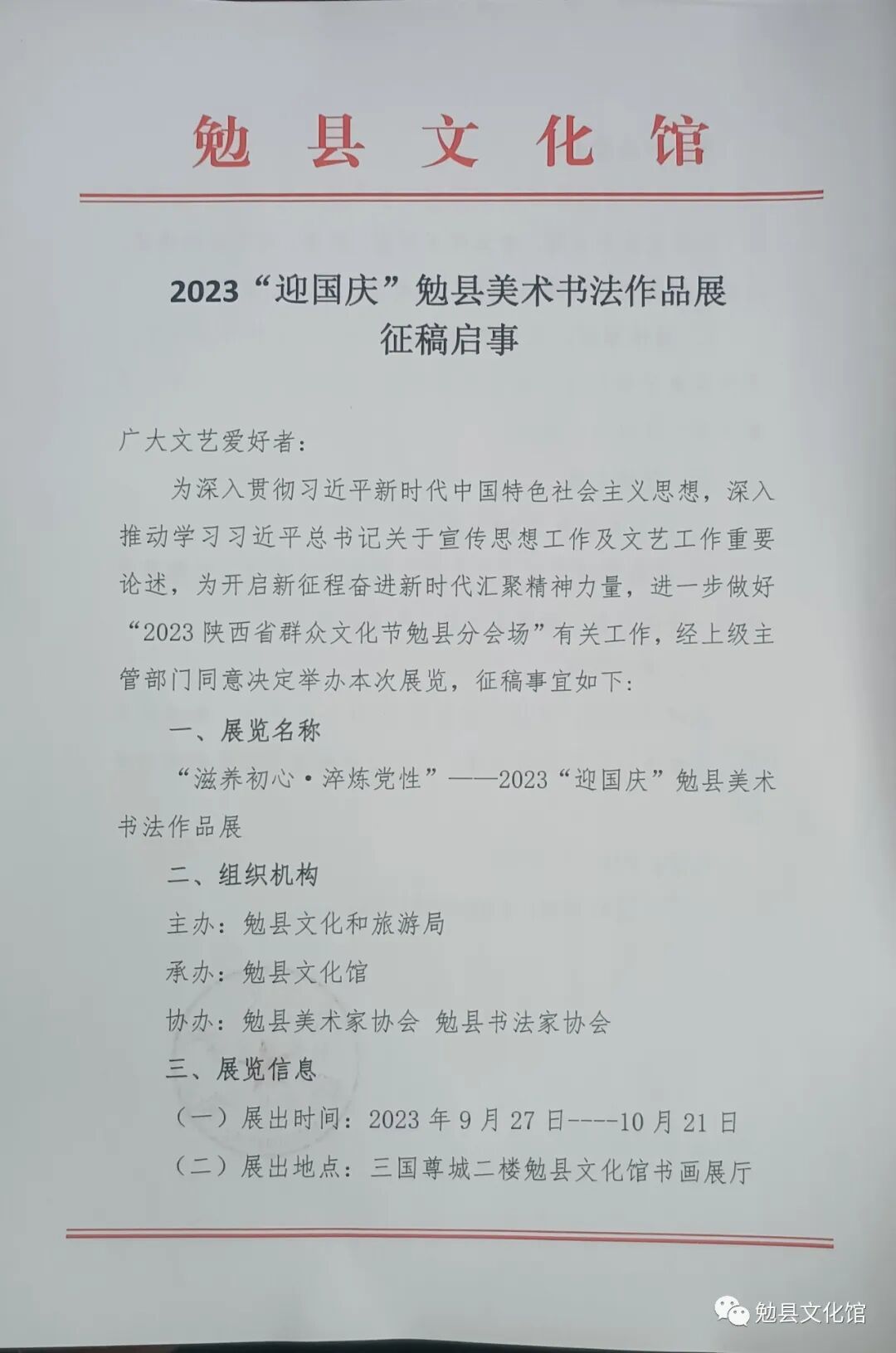 为深入贯彻习近平新时代中国特色社会主义思想,深入推动学习习近平总书记关于宣传思想工作及文艺工作重要论述,为开启新征程奋进新时代汇聚精神力量,进一步做好“2023陕西省群众文化节勉县分会场”有关工作,经上级主管部门同意决定举办本次展览,征稿事宜如下: