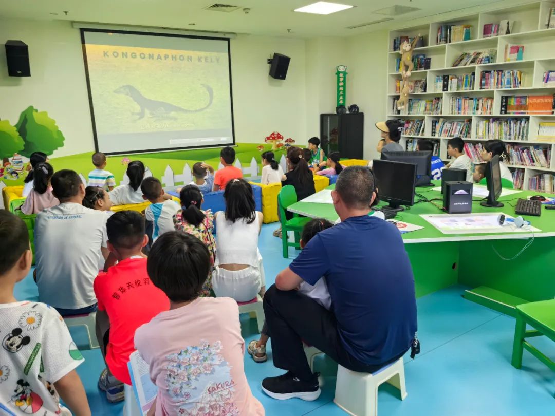 本期的主题是“地球生物·恐龙”。活动开始,为大家播放科普短视频“远古的地球霸主·恐龙”,让孩子们初步了解了恐龙的种类、起源、生活习性以及灭绝原因。随后孩子们两人一组,在志愿者的协助下戴上VR眼镜探秘远古时代的恐龙世界,让孩子们零距离与恐龙互动,感受身临其境的快感。体验中,孩子们一个个被眼前的景象所震撼!蓝天白云下巨大的恐龙张牙舞爪,霸王龙张开血盆大口能活生生吞下一头大象;翼龙飞着像大鹏,趴着像巨蜥;长颈龙高大威猛,它的脖子能占整个身体的四分之三;三角龙像自带矛和盾的大斗士,大脑袋上有三个尖尖的犄角,脑袋后面还有一个巨大的劲盾……整个活动孩子们异常兴奋,赞叹不已,引得围观的读者们也很是好奇。活动结束,孩子们还在回味,纷纷赞叹恐龙世界的奥妙与神奇,认为这次看到的远比在动画片中、画本子上的恐龙真实、过瘾。