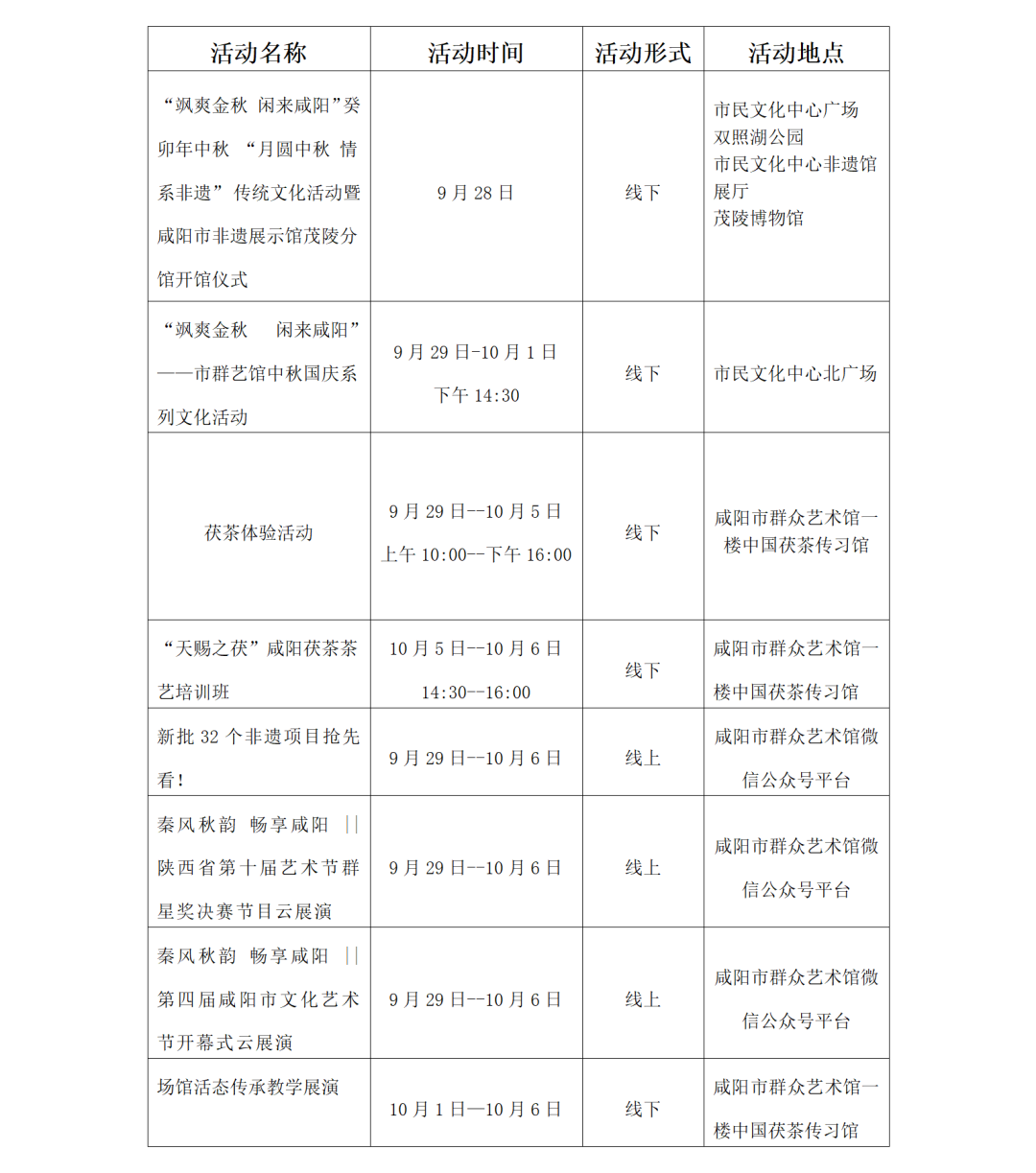 活动内容:本次活动以“飒爽金秋 闲来咸阳”为主题,紧紧围绕市委市政府中心工作,策划创作文艺节目,采用线上线下相结合的方式,开展形式多样、丰富多彩的开展专场及综合性文化系列文化惠民演出活动,以艺术的形式反映咸阳经济社会发展成就,让全市人民度过一个欢乐祥和、喜庆热烈的节日。