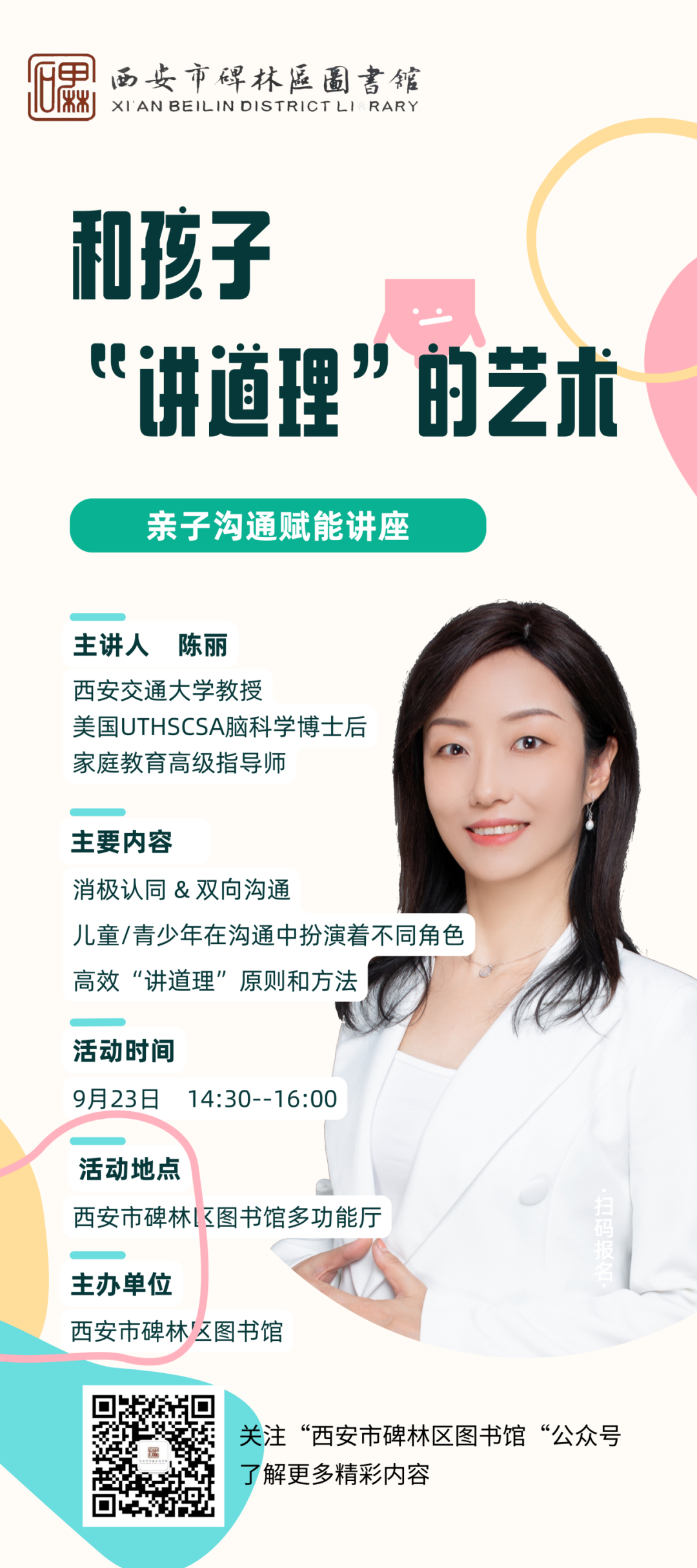讲 座 详 情 讲座时间 2023年9月23日 14:30——16:00 讲座主题 和孩子“讲道理”的艺术 亲子沟通赋能讲座 讲座地点 西安市碑林区图书馆多功能厅 主办单位 西安市碑林区图书馆 参与方式 扫描上方二维码,即可预约报名 主讲嘉宾:陈丽 西安交通大学教授,硕士生导师 美国UTHSCSA脑科学博士后 家庭教育高级指导师 研究方向 情绪障碍和学习记忆的脑功能研究 未成年人脑发育与情绪和行为的相关性 运用大脑发育规律进行智力与行为能力的开发 东西方未成年期教育模式和思维方式的探索 专长 婴幼儿、儿童及青春期生理与心理的健康构建 不同年龄段未成年人学习能力开发与行为习惯培养 儿童及青春期正面管教及亲子沟通技巧 温馨提示 1.图书馆温度较低,注意加衣。 2.图书馆地处钟楼附近,停车位稀少,请选择绿色出行。 3.路线: 地铁2号线-钟楼站C口出-环形地下通道4号口出-向南直行300约米路东 或乘坐603路/605路/K605路/608路/609路/616路/K616路/6路/11路/16路/K16路/26路/29路/K29路/35路/46路/203路/208路公交车,到钟楼南站下。