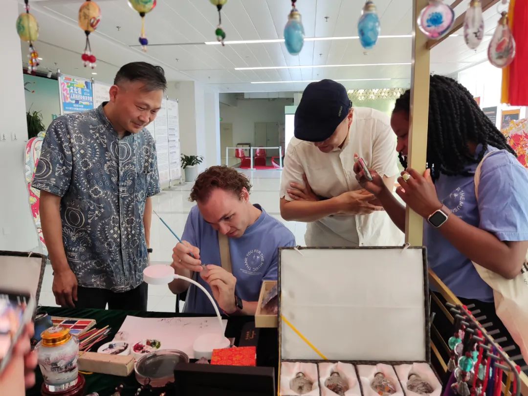 此外,宝鸡社火脸谱、西安剪纸、汉中藤编、棕扇、石雕、影雕、富县黑陶、延川布堆画、耀州陶瓷、古典插花、逢灯结绳、西秦刺绣、土织布、布艺等多个非遗项目也让学生们目不暇接,纷纷争相购买,久久不肯离去。他们表示陕西非遗非常有特色,作品非常精美,非遗故事很深奥很有趣,让人记忆深刻,很期待以后有更多机会来中国、来陕西进行文化交流。