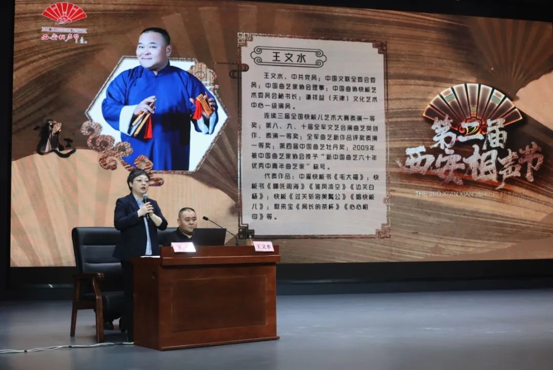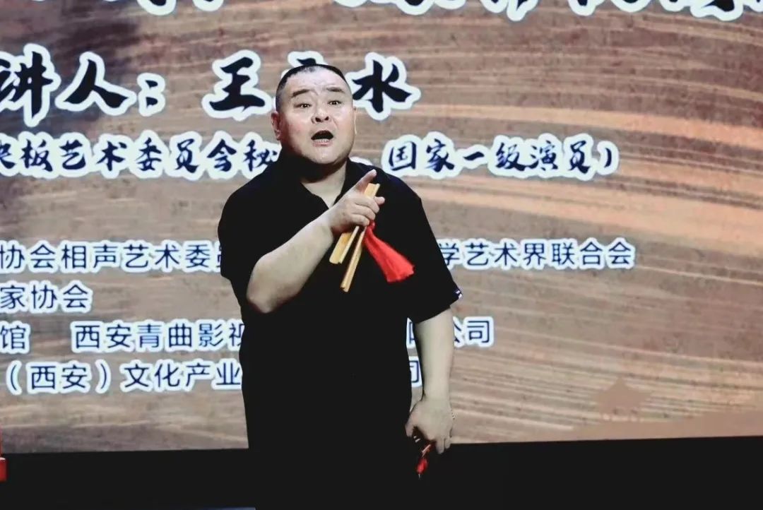 4月18日,由中国曲艺家协会相声艺术委员会、 陕西省文学艺术界联合会指导,陕西省曲艺家协会主办,陕西省文化馆、西安青曲影视文化传媒有限公司、青曲达人汇(西安)文化产业发展有限公司承办的陕西省曲协文艺“六进”志愿服务活动公益讲座在省文化馆曲江馆区举行。中国文联全委会委员、中国曲艺家协会理事、中国曲协快板艺术委员会秘书长、谦祥益(天津)文化艺术中心国家一级演员王文水围绕《我和大家聊快板》主题进行现场辅导授课。省文化馆副馆长王茵主持讲座,陕西省曲艺家协会主席苗阜、秘书长赵光远、陕西快板国家级非遗传承人刘文龙出席。现场80多位曲艺工作者、快板爱好者参加讲座。