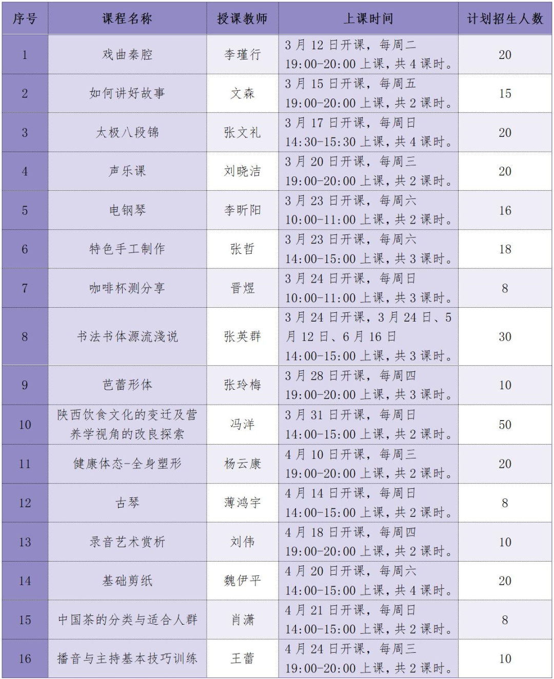 收费信息:免费为贯彻落实《“十四五”公共文化服务体系建设规划》中关于“扎根时代生活,遵循美育特点,深入开展全民艺术普及工作”的要求,在陕西省文化和旅游厅的指导下,由陕西省文化馆主办、陕西文化音像出版社协办的“三秦四季·公益学堂”春季课堂即将火热开班啦!