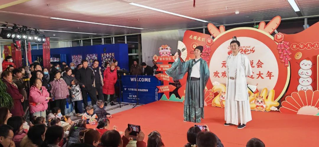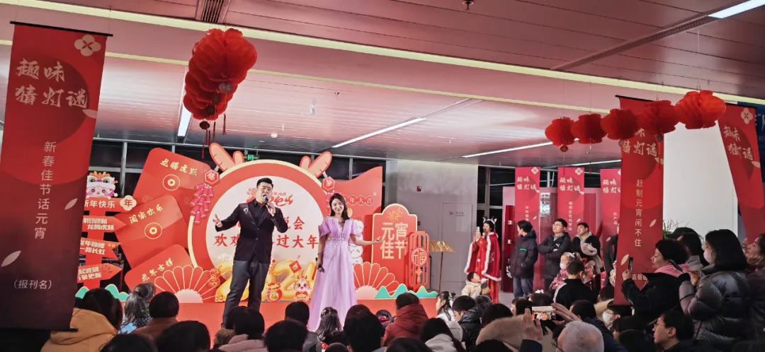 活动区,游客们津津有味地参与活动互动。猜灯谜环节,在各式缀着灯谜纸条的红色花灯下,游客们驻足思索,七嘴八舌地讨论着谜底,争相回答主持人的提问。对诗环节,小朋友们一个个神采奕奕,每每在主持人话音刚落,便迅速答出诗句下联,在拿到奖品后,洋溢出自信而灿烂的笑容。诗与歌展演环节,声情并茂地诗朗诵《闹元宵》《元宵里的长安》《灯火阑珊 醉长安》《将进酒》,将人的思绪延展,穿越古今,领略千年来的壮美诗篇与万丈豪情;空灵清幽的古琴独奏《雪山春晓》带来春日的气息与温暖;欢快热闹的陕北民歌《挂红灯》《五哥放羊》带来节日的喜庆;歌曲《花好月圆》《灯火里的中国》更是迎来全场大合唱,将现场气氛推动至高潮,唱出了在场每一个人对美好生活的向往和对伟大祖国深深的爱与祝福。
