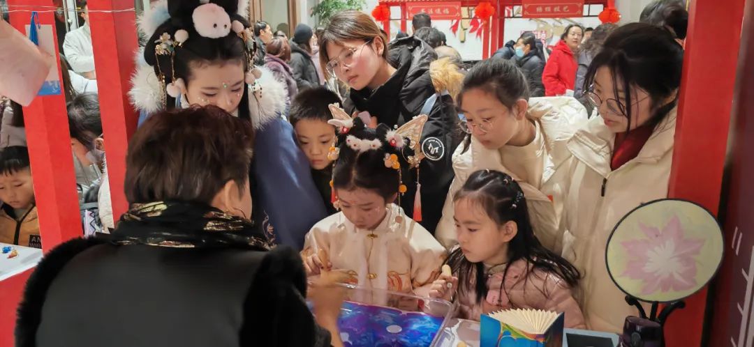 霞光渐逝,曲江馆区灯火如昼,人头攒动。非遗民俗区,传统非遗技艺展示精彩绝伦。唐流彩展示区,浸润着精美图案的云扇在出水的瞬间美轮美奂,让在场游客啧啧称奇,爱不释手;剪纸展示区,艺人现场展示高超技艺,在剪刀灵活地变换中,一幅幅形态多样、寓意美好的作品跃然纸上;糖人糖画展示区,一块块糖泥在非遗传承人的手中,呈现出多种形态,栩栩如生,引来在场小朋友的阵阵欢呼。此外,色彩明艳、造型独特的彩绘泥塑,芬芳雅致的结绳香囊也赢得一致好评。