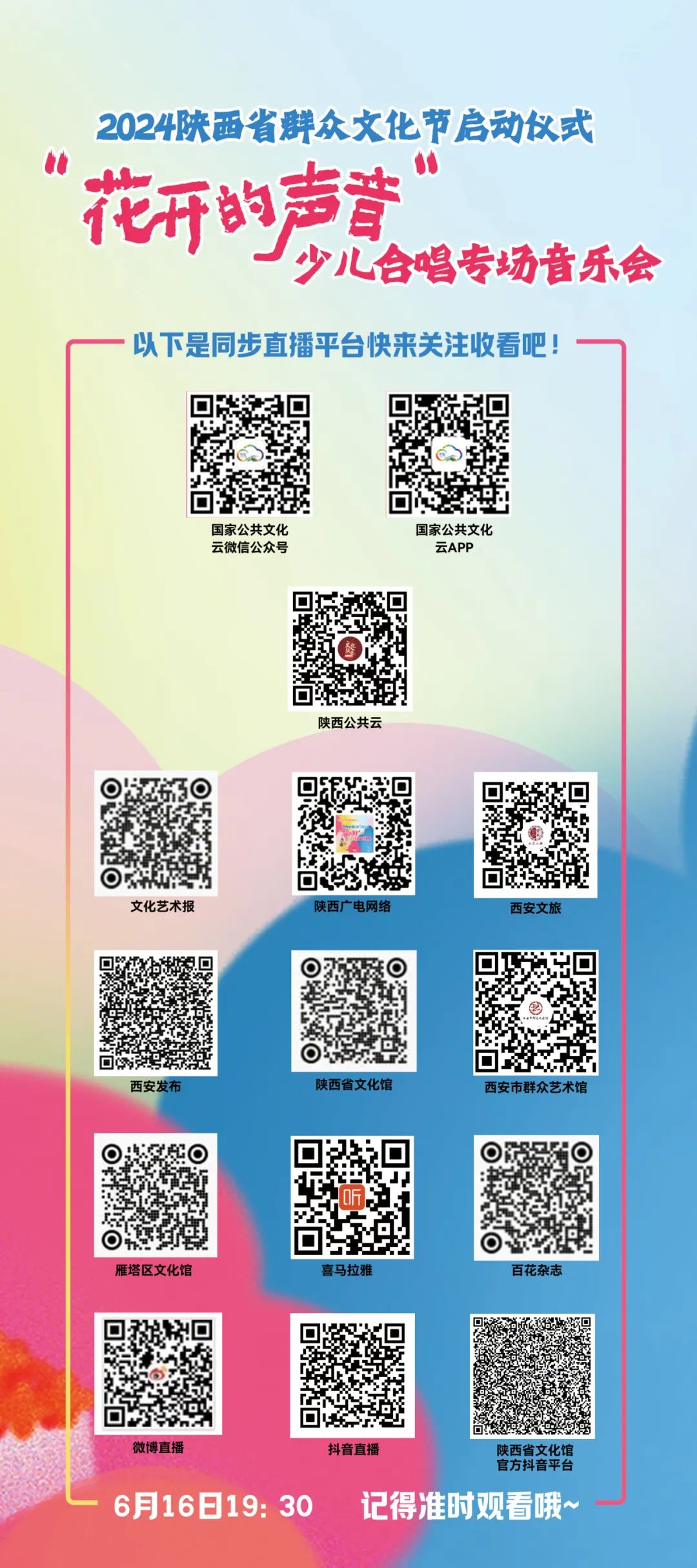 收费信息:免费随着盛夏的脚步悄然而至,一场音乐的盛宴如期而至。为深入学习贯彻习近平文化思想,推动公共文化服务高质量发展,引导少儿合唱活动蓬勃开展,进一步推动陕西省少儿合唱事业繁荣发展,紧紧围绕以歌声庆祝中华人民共和国成立75周年,唱响新时代主旋律,由文化和旅游部公共服务司、陕西省文化和旅游厅主办,陕西省文化馆、西安市文化和旅游局、中共西安市雁塔区委、西安市雁塔区人民政府共同承办的2024陕西省群众文化节启动仪式“花开的声音”少儿合唱专场音乐会即将于6月16日精彩启幕。 据悉,2024年陕西省群众文化节将充分发挥文化培根铸魂、凝心聚力的作用,凝聚全省公共文化服务高质量发展新思路,为陕西省少儿文化教育发展提供新的探索与鲜活实践,特举办少儿合唱专场音乐会。此次音乐会汇集来自全省10个地市共13支优秀少儿合唱团队,孩子们将以至纯至善的天籁之音唱少年朝气、唱心中繁花、唱响青春与梦想。 音乐会的曲目设置丰富多样,充满了创新与活力。《中国》《最初的梦想》《明天》《期待的远方》《我仰望五星红旗》等15首歌曲将精彩呈现。其中,少儿汉藏双语歌曲将带领观众领略不同民族文化的魅力,感受中华大家庭的和谐与温暖。古风歌曲则将以优美的旋律和深情的歌词,引领观众穿越历史的长河,体验古代文化的韵味与魅力。同时还有展现陕南地区独特的茶文化和生活风情的采茶曲,唱响青春与朝气,助力中华非遗文化的传承和发展。 据了解,陕西省群众文化节是经省委、省政府批准,由省文化和旅游厅主办的节庆活动之一,此前已成功举办五届,通过打造公共文化服务链,不断提升人民群众的文化获得感幸福感。本次少儿合唱专场音乐会是2024陕西省群众文化节的重要组成部分,也是陕西省组织参加“歌唱祖国”大家唱群众歌咏活动的生动实践,旨在用合唱艺术展现全省群众守正创新、踔厉奋发、勇毅前行良好精神面貌,用歌声唱响新时代主旋律。 6月16日,本次活动除在西安音乐学院现场亮相外,演出还将通过国家公共文化云等平台进行直播,让更多群众在云端共享合唱艺术盛宴。