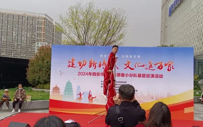 为大力弘扬“奉献、友爱、互助、进步”的志愿者精神,广泛开展“学雷锋”志愿服务月活动,丰富群众的精神文化生活,3月27日,由西安市文化和旅游局主办,西安市群众艺术馆承办,西安市雁塔区文化馆、西安市雁塔区杜城街道综合文化站、西安市雁塔区万科高新华府社区协办的“建功新时代 文化进万家”2024年西安市文艺志愿者小分队基层巡演活动,走进雁塔区万科高新华府社区,为广大社区群众带来一场精彩的文艺演出。 作为2024年文艺志愿者小分队基层巡演活动首场演出,文艺志愿者们以积极向上的精神风貌倾情投入到表演中,活动现场气氛高涨,舞蹈、曲艺、歌曲等节目的精彩演出伴随着台下观众的欢声笑语传遍整个活动现场,受到社区群众广泛好评。 作为宣传阵地的排头兵,西安市文艺志愿者小分队将充分发挥文艺小分队反应迅速、服务形式灵活的优点,持续开展小分队巡演活动,努力提升群众对精神文化生活的满足感、幸福感。