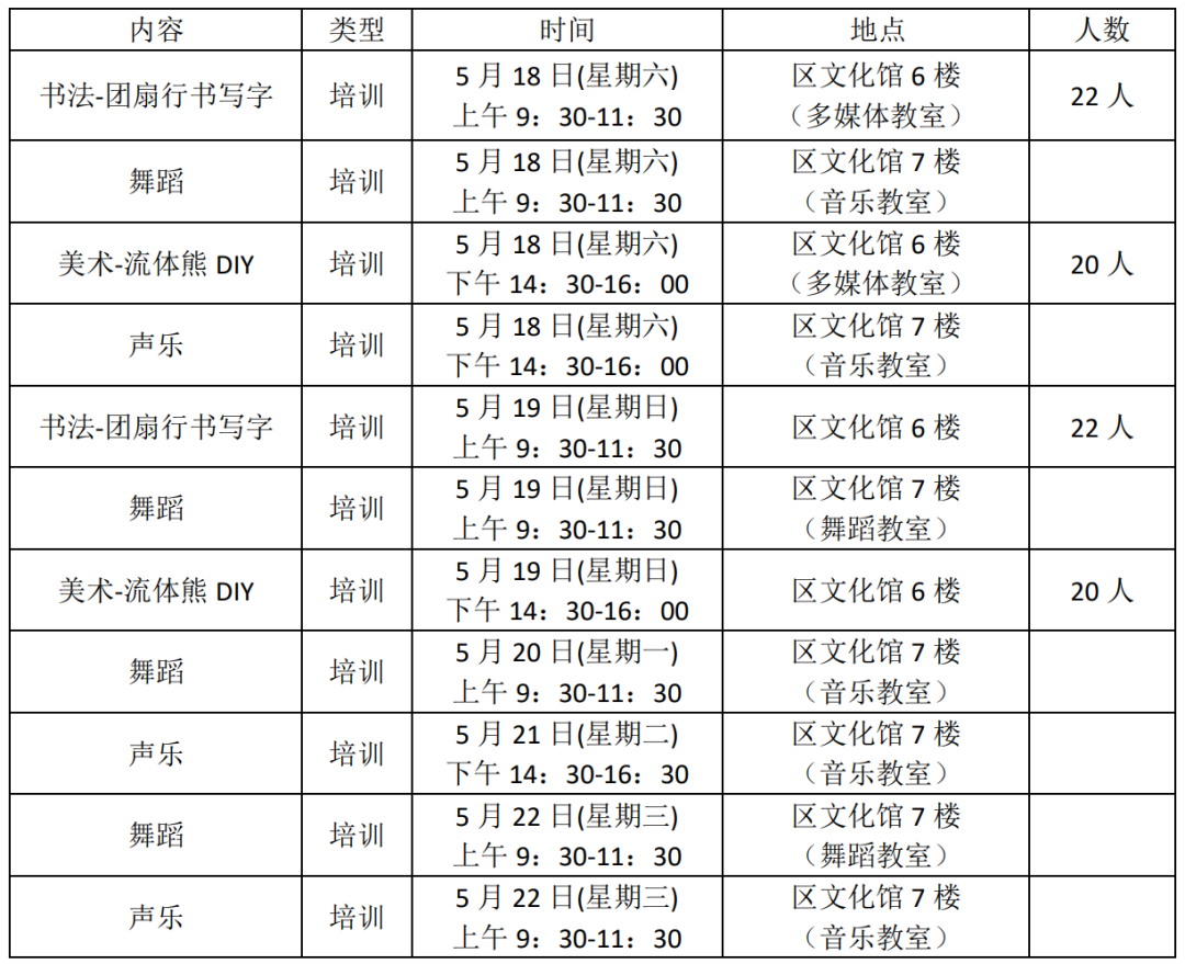 收费信息:免费公益培训体验活动 “我们的中国梦 文化进万家”暨“雁塔邀您 艺起精彩” 区级机关各部门、各街道: 为满足我区广大艺术爱好者的文化需求,丰富广大机关干部的业余文化生活,激发全民学习艺术热情,陶冶新时代职工生活的艺术品质,全力打造全区艺术普及服务品牌。雁塔区文化馆拟开展“雁塔邀您 艺起精彩——公益培训体验活动,现将具体通知如下: 01 活动主题 “我们的中国梦 文化进万家”暨“雁塔邀您 艺起精彩” ——公益培训体验活动 02 主办单位 雁塔区文化馆 03 培训对象 区及机关各部门、各街道文化专干及艺术爱好者 04 培训地点 雁塔区文化馆(长安中路嘉汇大厦6/7楼) 05 培训时间 见下表 06 有关事项 1.身体健康、无重大疾病,对艺术有浓厚兴趣的爱好者。 2.培训期间个人安全问题均由学员本人负责。 3.采取电话预约报名(名额有限、额满为止)。 4.报名时间:早9:30-11:30,下午14:30-17:00。 5.公益培训不收取任何与培训相关的学费。 6.美术培训限6-12岁儿童参与,一位家长陪同。 7.书法、美术培训每人限报名一次。 报名电话: 85251486