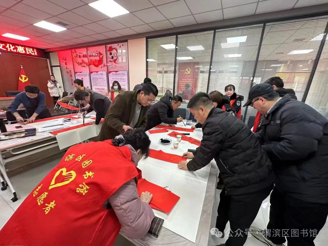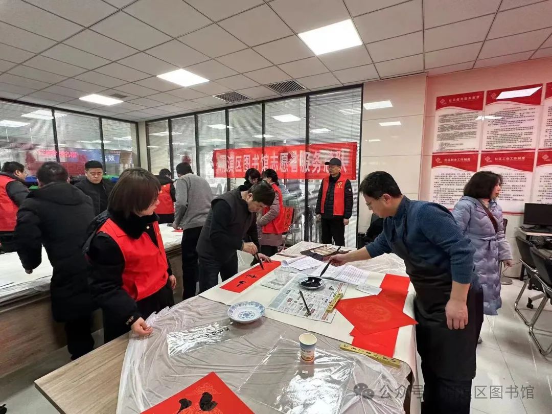 恭贺新春满堂春”、“吉星高照”、“国泰民安”一幅幅新鲜出炉的新春对联,一个个“福”字千变万化,承载着人们对新年美好的祝愿。热爱书法艺术的志愿者们一边与书法名家交流精湛的书法技艺,一边推敲春联的措辞用句,大家互相交换墨宝,为邻里好友赠送春联福字,场面热闹而欢乐,飘散着浓浓的新年气息。 通过此次活动,为社区周边居民群众营造了新年浓郁的节庆氛围,增强了社区的和谐氛围,保障了广大市民普惠均等享受公共文化基本权益。今后,我馆将联合社区继续开展丰富多彩、形式多样的文化交流活动,让优秀中华传统文化浸润社区居民,全力为基层群众提供方便快捷的公共文化服务,进一步提升群众的文化获得感,推动全民阅读的纵深发展。