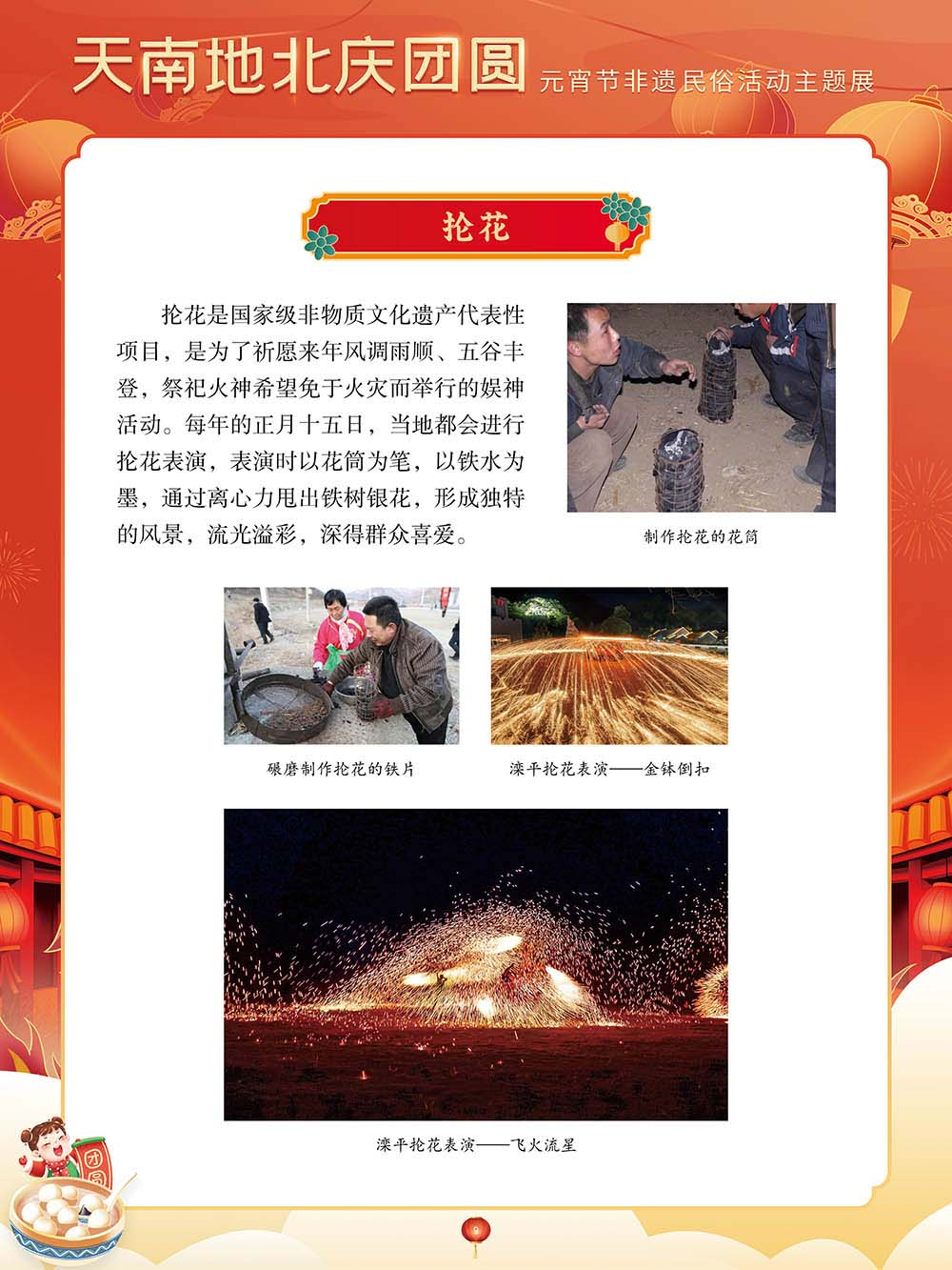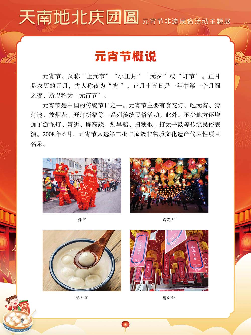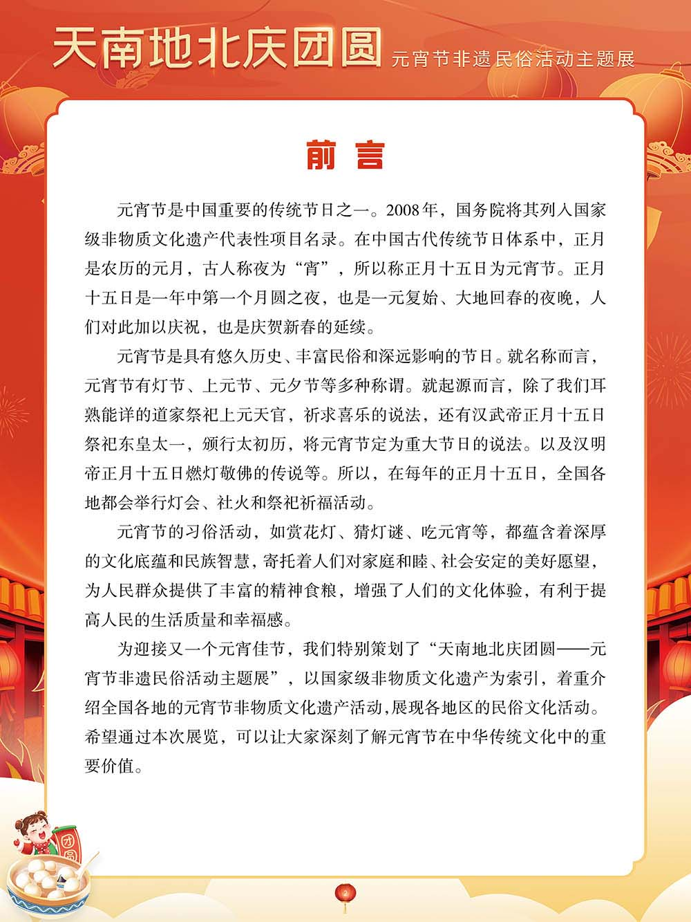 为迎接又一个元宵佳节,我们特别策划了“天南地北庆团圆——元宵节非遗民俗活动主题展”,以国家级非物质文化遗产为索引,着重介绍全国各地的元宵节非物质文化遗产活动,展现各地区的民俗文化活动。希望通过本次展览,可以让大家深刻了解元宵节在中华传统文化中的重要价值。