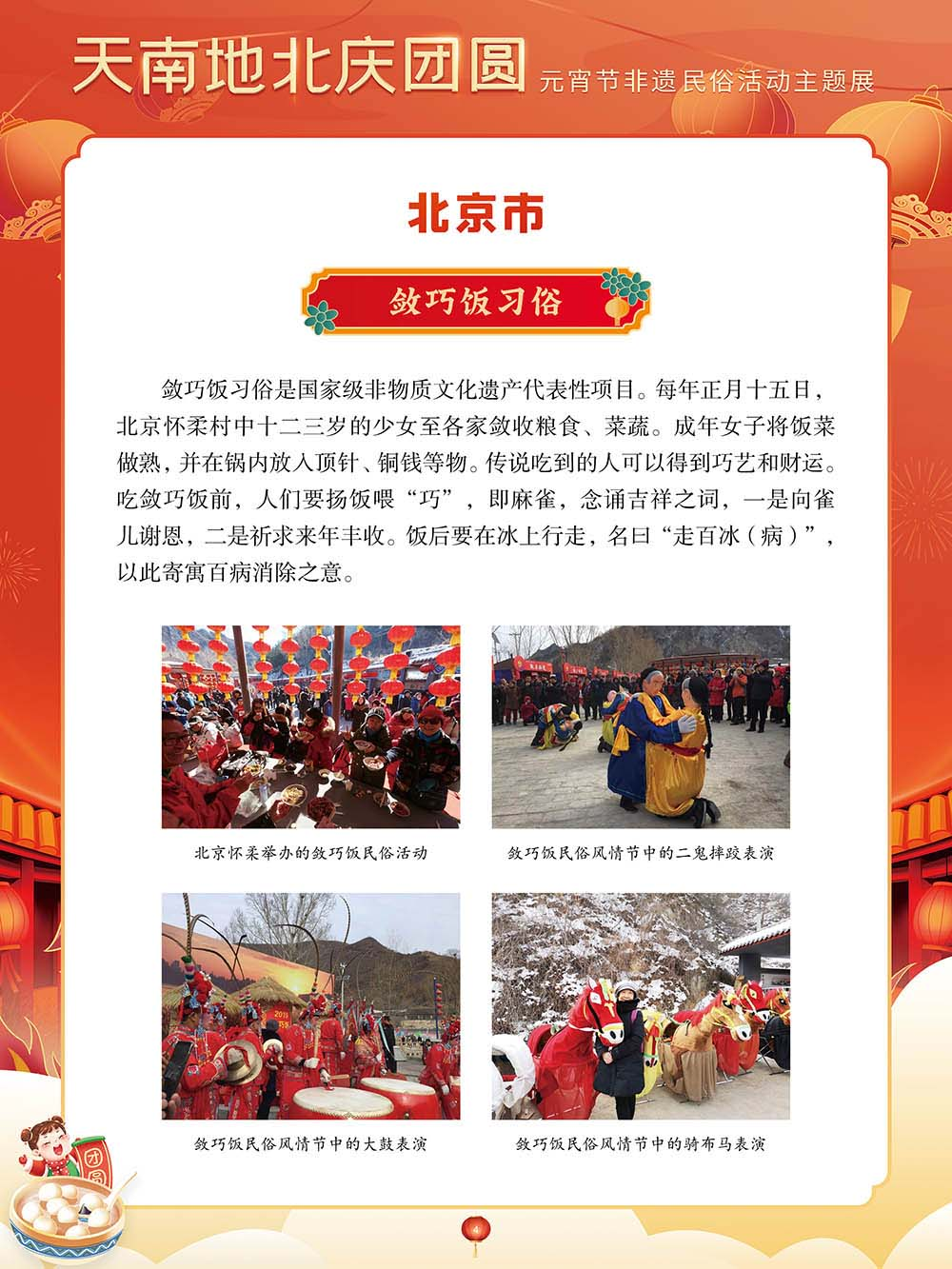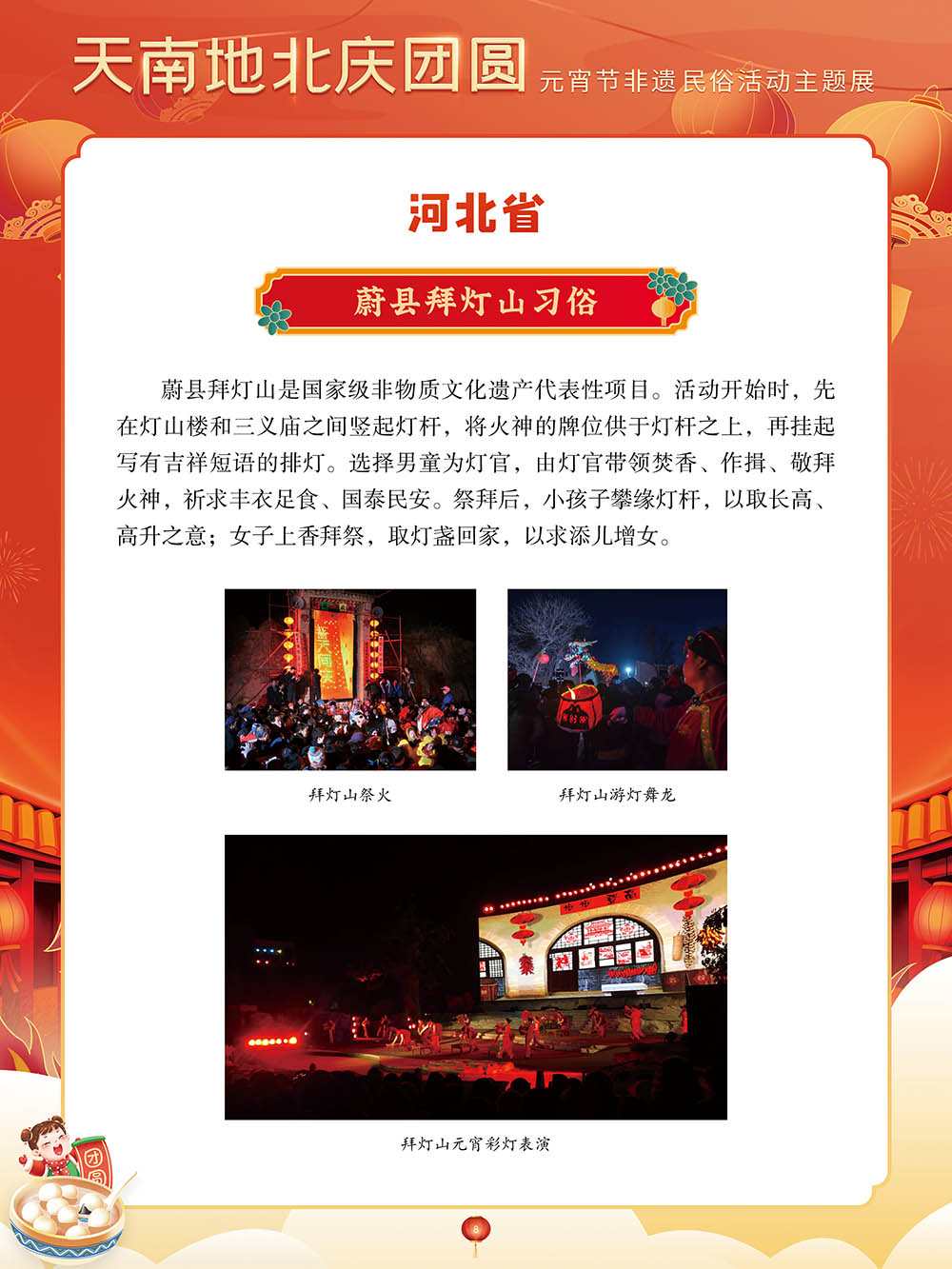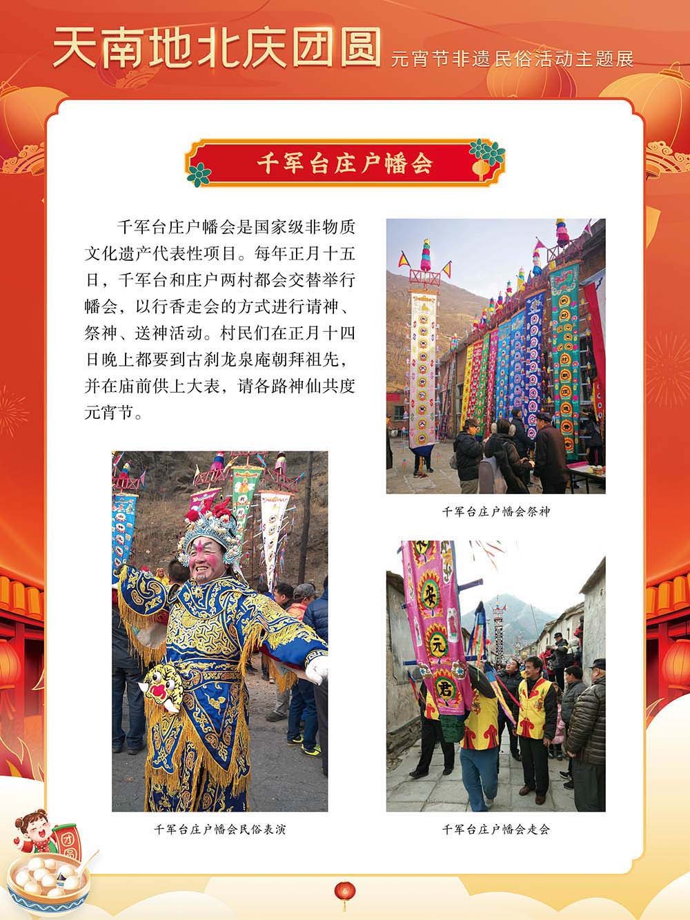 为迎接又一个元宵佳节,我们特别策划了“天南地北庆团圆——元宵节非遗民俗活动主题展”,以国家级非物质文化遗产为索引,着重介绍全国各地的元宵节非物质文化遗产活动,展现各地区的民俗文化活动。希望通过本次展览,可以让大家深刻了解元宵节在中华传统文化中的重要价值。