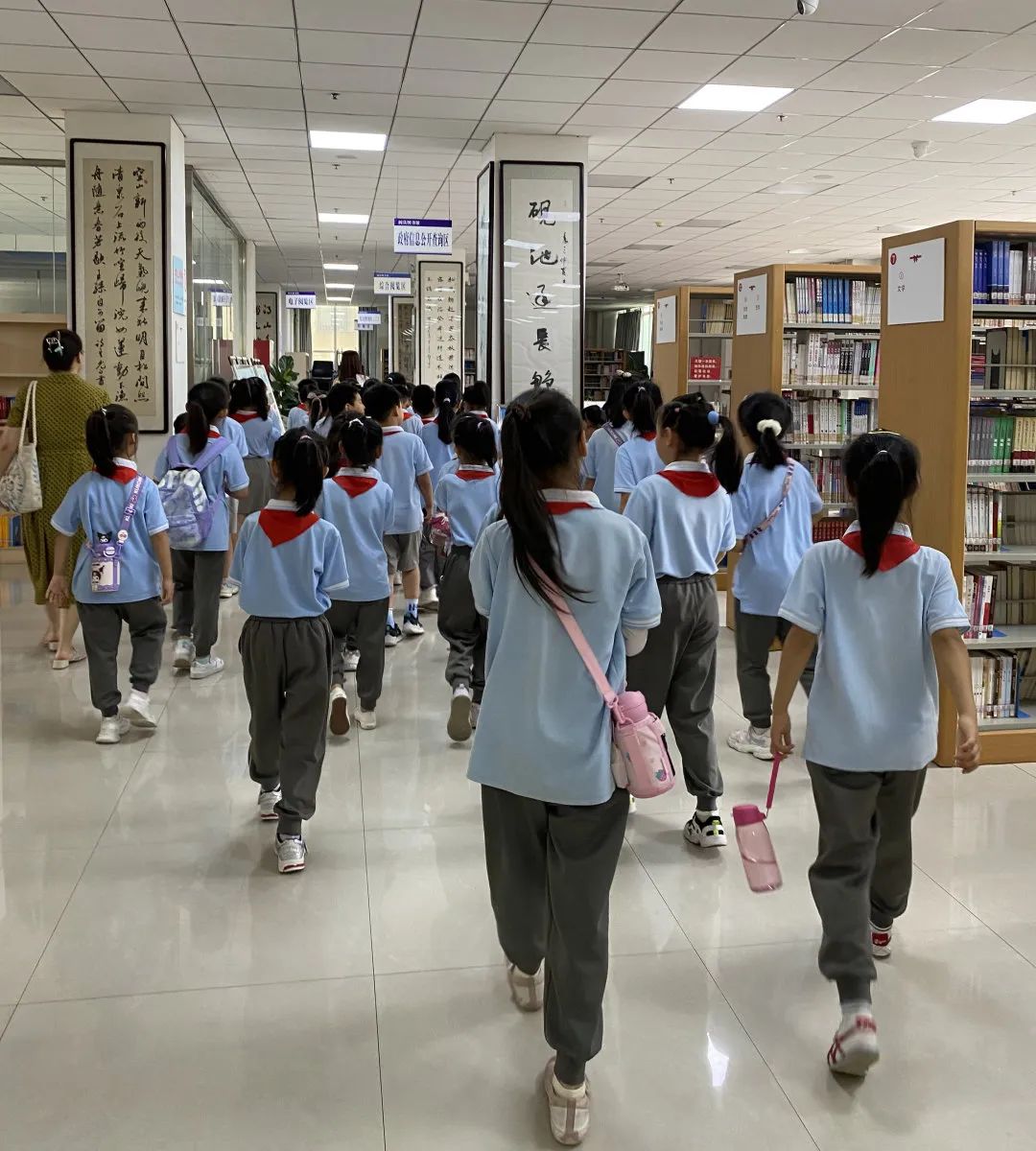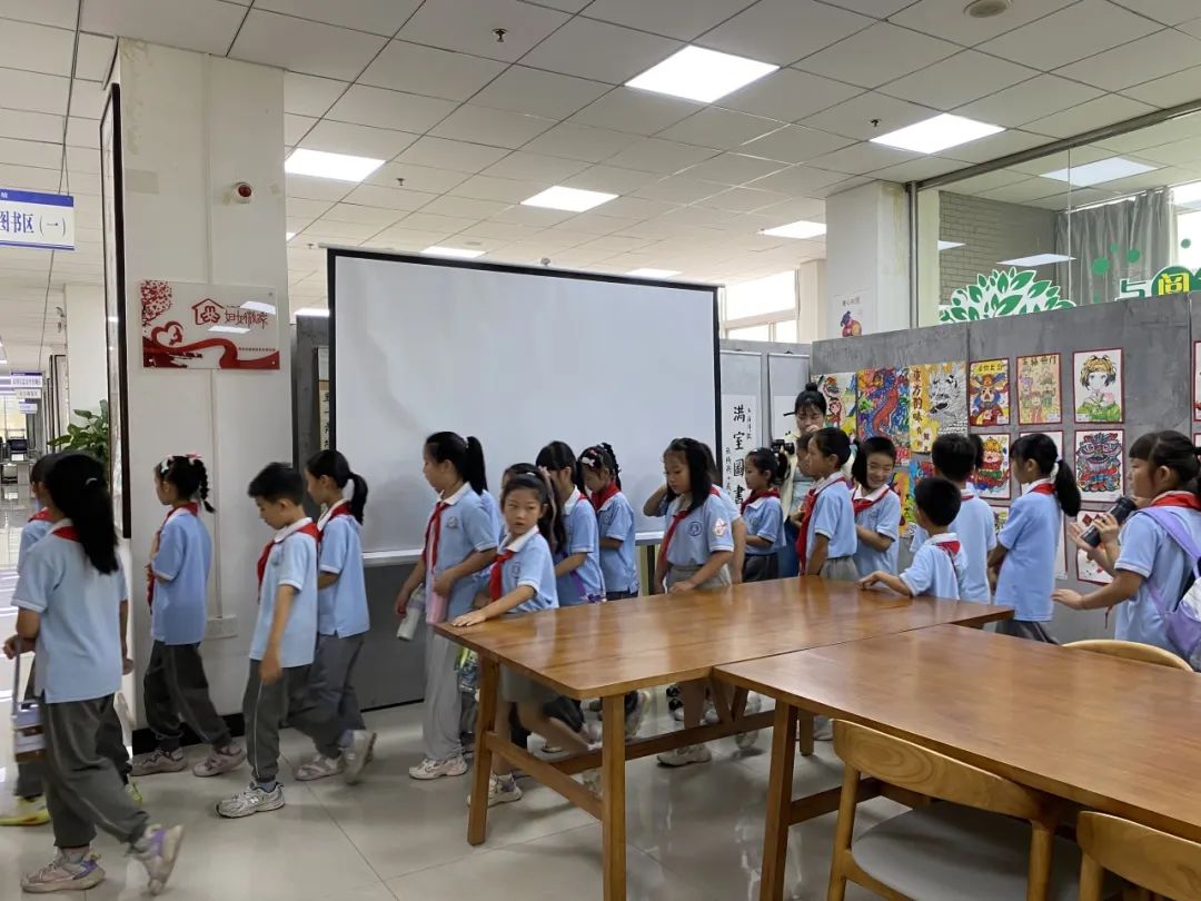 收费信息:免费 走进图书馆,同学们就被书架上各种各样的书籍深深吸引住了。在馆员老师的引导下,同学们依次参观了图书馆一楼、二楼的开放区域。 馆员老师给同学们介绍了区图书馆的概况,为同学们讲解如何自助办证、如何自助借阅,鼓励同学们和家长一起走进图书馆,从小养成良好的阅读习惯。 在参观二楼少儿书画展时,同学们对这些同龄人创作的书画作品不停发出赞叹。一百余幅色彩绚烂、种类多样的作品,让同学们感受到书法绘画艺术的美好和奇妙。