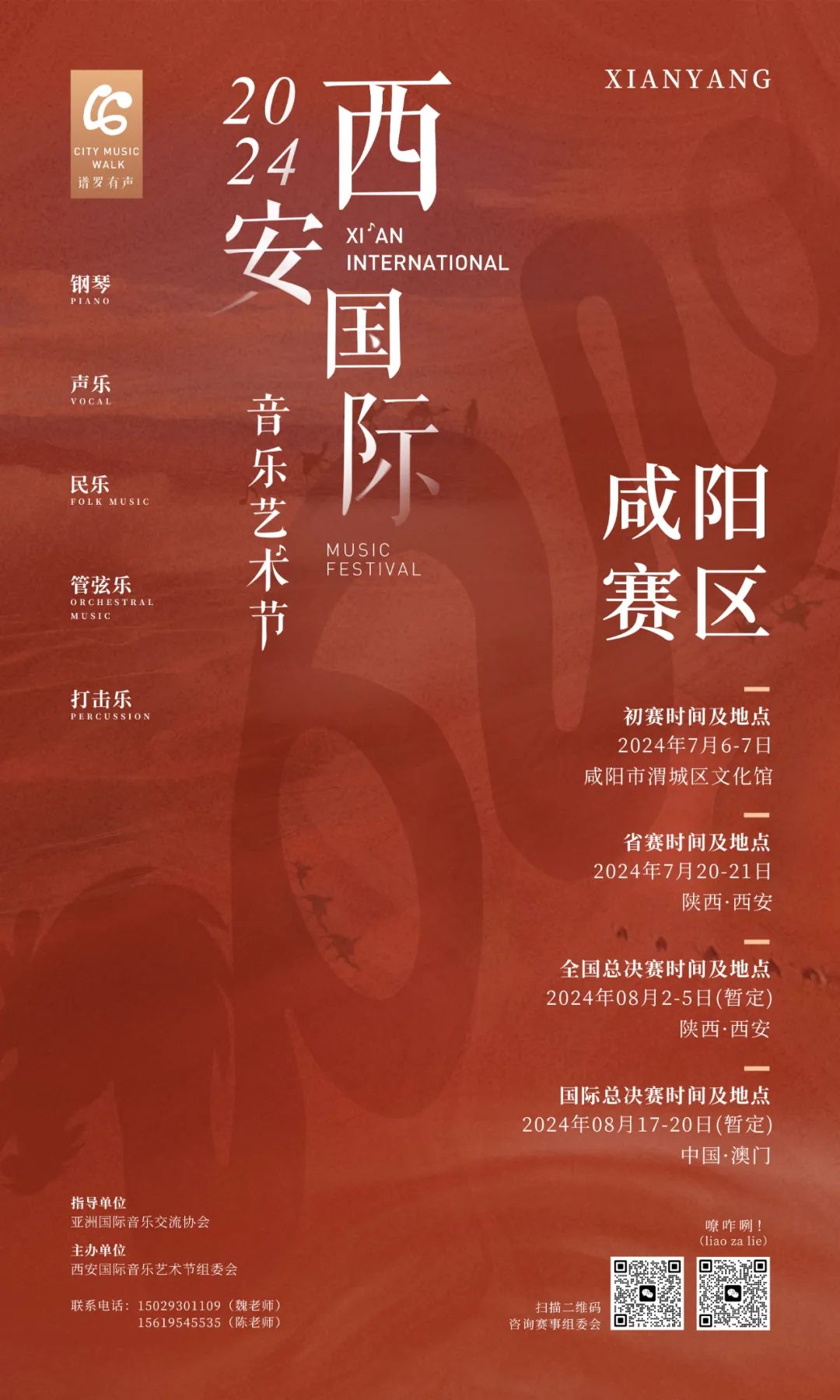 报名时间:即日起至2024年6月20日 比赛时间:2024年7月6日—7月7日 比赛地点:咸阳市渭城区文化馆 比赛时间:2024年7月20日—7月21日 比赛地点:陕西·西安 比赛时间:2024年8月2日—8月5日(暂定) 比赛地点:陕西·西安 比赛时间:2024年8月17日—8月20日(暂定) 比赛地点:中国·澳门 扫描微信二维码咨询报名 ① 报名时请谨慎填写各项报名资料,如经发现报名资料不实,即取消参赛资格或获奖资格; ② 如有特殊情况不能参赛的选手,需提前15个工作日和组委会联系可以退回报名费,逾期不退还; ③ 参赛名单一经公布,报名费不予退还; ④ 比赛选手一小时后未签到者视为自行放弃参赛资格,报名费不予退还; ⑤ 比赛自选曲目一首,比赛曲目在提交报名材料之后不得更换,比赛实际曲目与所报曲目不符,评委有权终止参赛者表演。 魏老师:15029301109 陈老师:15619545535