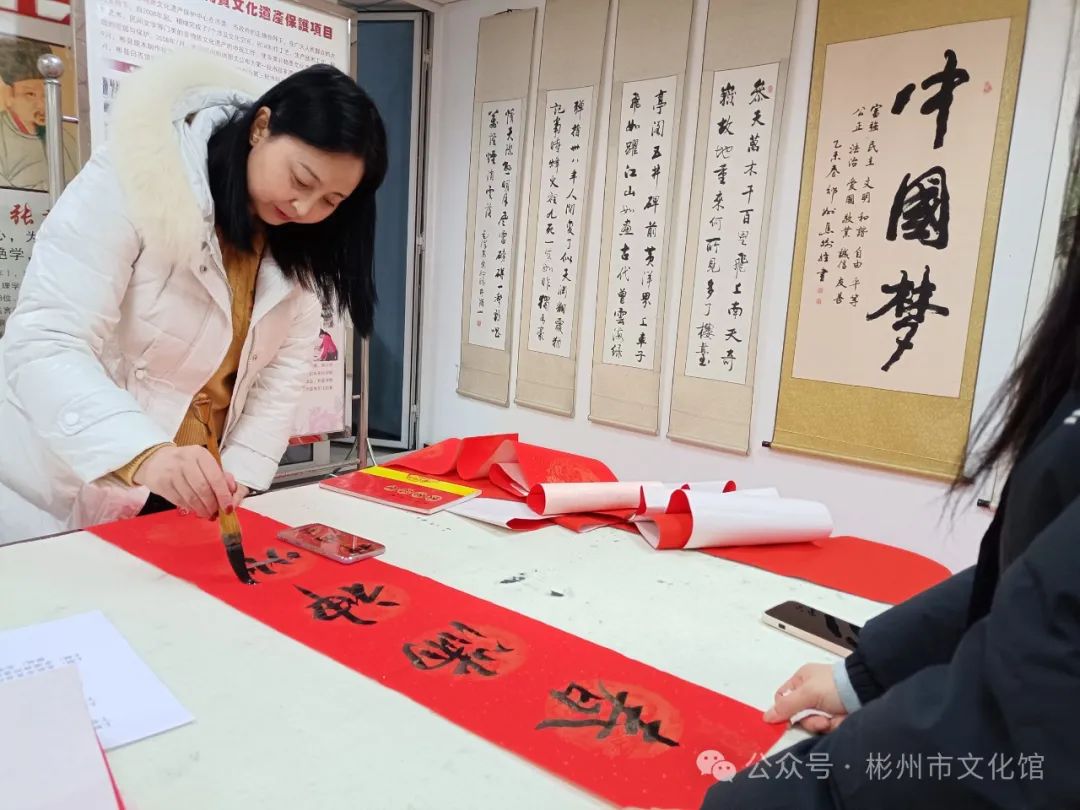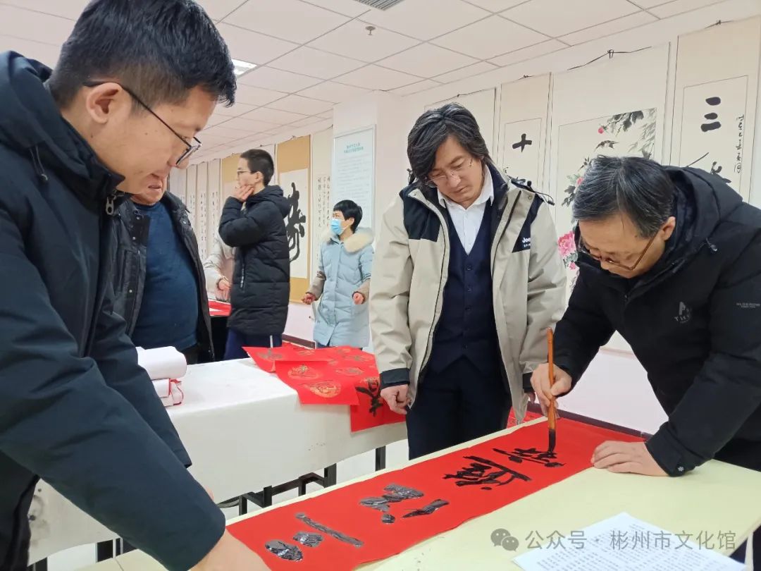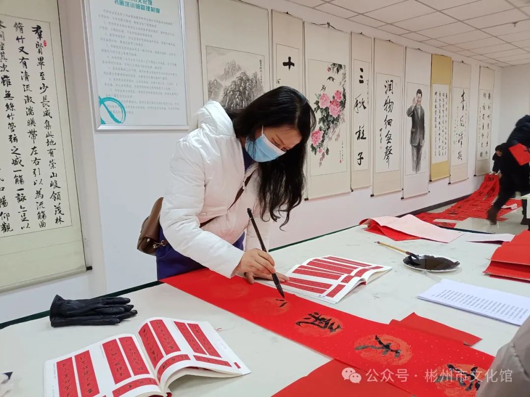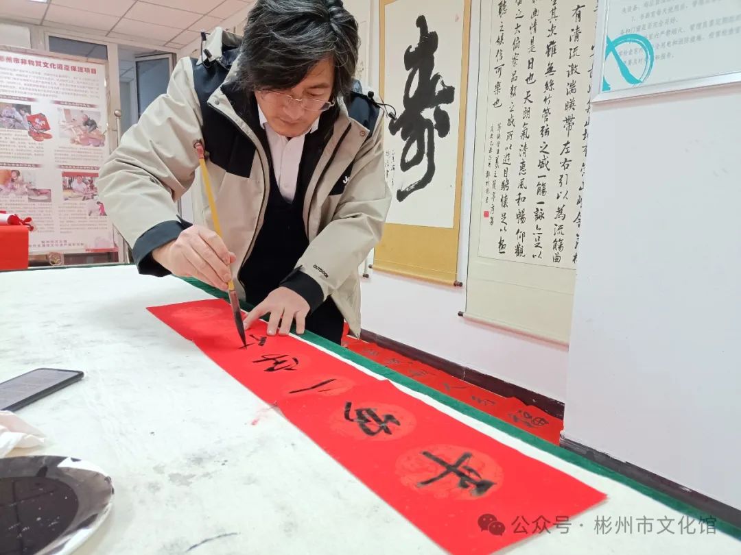 春节将至,年味渐浓。为了弘扬中华传统文化,增添节日气氛,营造欢乐祥和的节日氛围,2月2日下午,彬州市文化馆举办了“翰墨飘香·写春联送祝福”文化惠民活动。 龙年大吉新春快乐 写春联,作为我们的一种传统习俗,包含着浓浓的中国色彩。它是笔尖上的年味,是红红火火的福祉,是民俗中传承千年的宝藏。 无联不成春,有联春愈浓。尽管寒风习习,漫天飘雪,但是依旧没有影响各位书法创作者的热情,活动现场,翰墨飘香,暖意融融,书法创作者们挥毫泼墨、笔走龙蛇,志愿者们忙着压纸、晾春联。 “一元复始龙增岁,万象生辉燕报春”“龙飞凤舞迎新岁,福禄双全贺佳节”,书写的春联笔墨苍劲、寓意美好,本次活动共创作了200余副春联,一副副满载祝福的春联,一张张寓意吉祥的“福”字,在这些作品的字里行间都流淌着对新的一年美好祝愿,也为即将到来的新春佳节增添了浓浓年味。 一幅幅精美的春联气韵生动,一笔一画之间浓缩浓郁的文化气息。文化创作现场欢声笑语,一派祥和欢乐的氛围,吸引了不少群众的围观驻足,大家共同感受着喜庆祥和、年味十足的文化氛围。