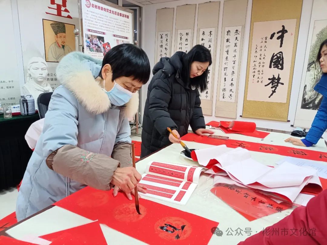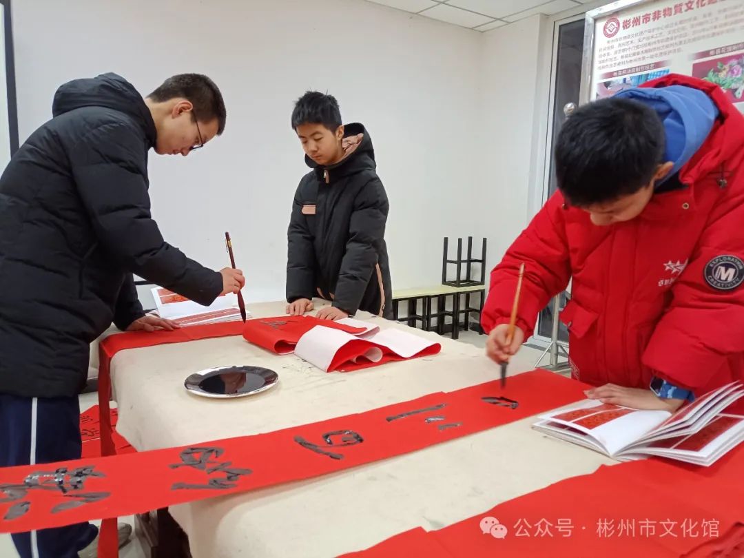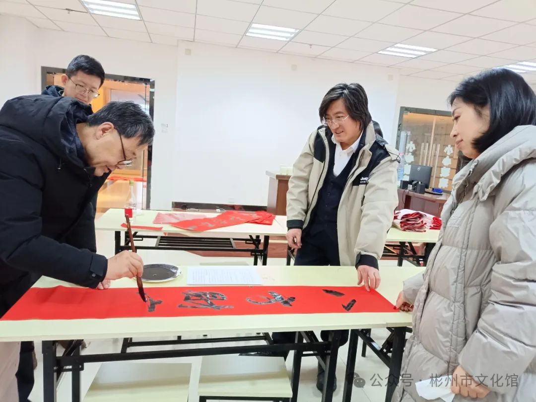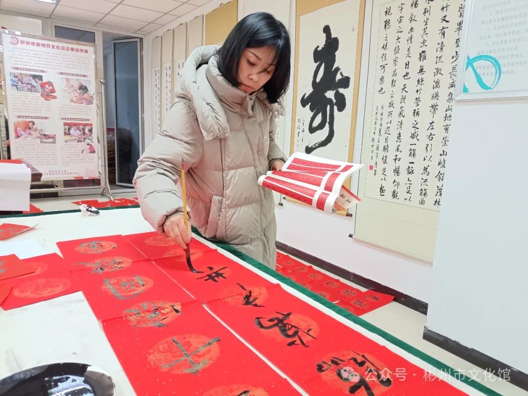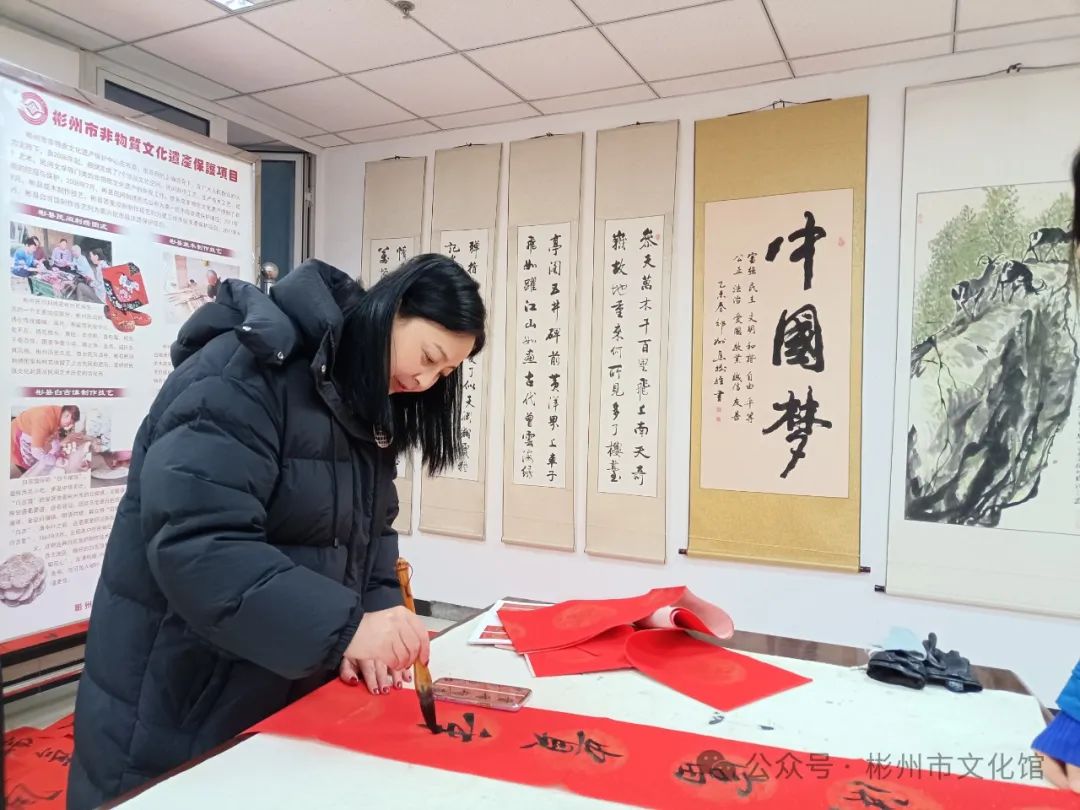 春节将至,年味渐浓。为了弘扬中华传统文化,增添节日气氛,营造欢乐祥和的节日氛围,2月2日下午,彬州市文化馆举办了“翰墨飘香·写春联送祝福”文化惠民活动。 龙年大吉新春快乐 写春联,作为我们的一种传统习俗,包含着浓浓的中国色彩。它是笔尖上的年味,是红红火火的福祉,是民俗中传承千年的宝藏。 无联不成春,有联春愈浓。尽管寒风习习,漫天飘雪,但是依旧没有影响各位书法创作者的热情,活动现场,翰墨飘香,暖意融融,书法创作者们挥毫泼墨、笔走龙蛇,志愿者们忙着压纸、晾春联。 “一元复始龙增岁,万象生辉燕报春”“龙飞凤舞迎新岁,福禄双全贺佳节”,书写的春联笔墨苍劲、寓意美好,本次活动共创作了200余副春联,一副副满载祝福的春联,一张张寓意吉祥的“福”字,在这些作品的字里行间都流淌着对新的一年美好祝愿,也为即将到来的新春佳节增添了浓浓年味。 一幅幅精美的春联气韵生动,一笔一画之间浓缩浓郁的文化气息。文化创作现场欢声笑语,一派祥和欢乐的氛围,吸引了不少群众的围观驻足,大家共同感受着喜庆祥和、年味十足的文化氛围。