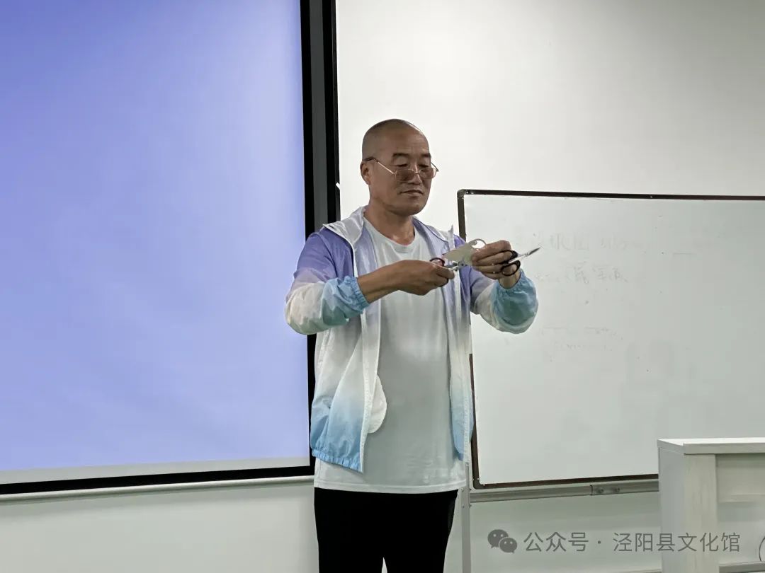 ▲县文化馆馆长张晓燕做题为《弘扬传统文化 保护地方非遗》的讲座。 ▲白蟒塬孙氏剪纸传承人孙学义现场演示剪纸技艺。 ▲工作人员发放宣传资料。