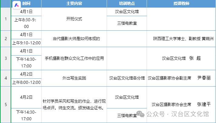 本次摄影培训为期2天,共招收40名学员。时间为2024年4月1日至4月2日。请各镇、街道办事处、区文化馆各分馆、各部门单位,各区文化馆社会分馆、文艺团体在3月28日前将报名表报送至汉台区文化馆艺术一股。摄影爱好者、摄影家协会会员可将报名表报送汉台区摄影家协会。