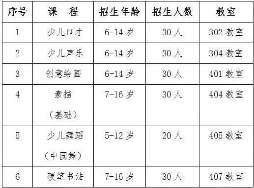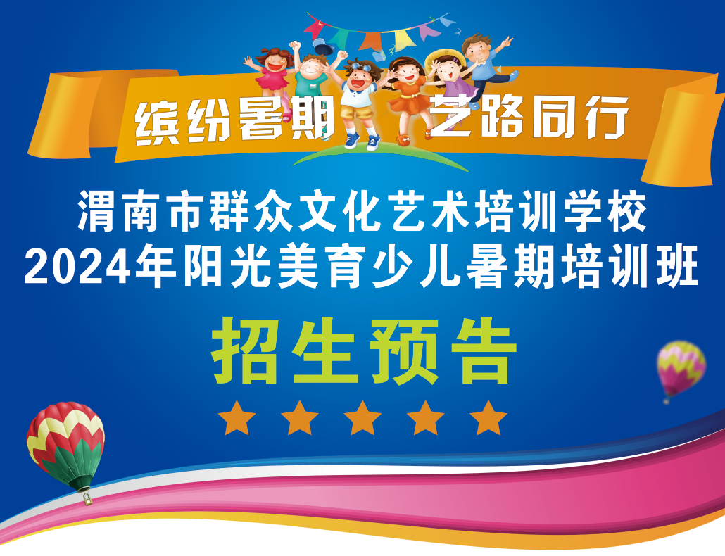 “阳光美育”是渭南市群众文化艺术培训学校为少年儿童精心打造的文化艺术培训项目,2024年“阳光美育”暑期少儿培训招生即将启动,欢迎适龄儿童踊跃报名。 一、开设专业 少儿口才、 少儿声乐、 创意绘画、素描(基础)、少儿舞蹈、硬笔书法 课程安排表 二、培训时间 2024年7月8日—7月26日 (每周一至周五上午9:00—11:00) 三、培训地点 渭南市文化艺术中心培训楼各专业教室 四、报名时间 2024年6月29日—7月5日 (9:00—17:00) 周六、周日正常报名,名额有限,额满即止。 五、报名地址 渭南市文化艺术中心 (渭南市临渭区三贤路北段) 培训楼313办公室 六、报名咨询电话 电话:0913—8135280 15609130787 七、报名须知 1.学员免交学费,仅须交一定的教学工本费,每人每科100元,包含教材、学习用具等。 2.报名时需带孩子的户口簿或身份证复印件、1寸彩色证件照2张。 3.学校或社区推荐的贫困生和留守儿童持证明,免交学费及教学工本费。 往期培训掠影 少儿舞蹈教学 少儿声乐教学 创意绘画教学 少儿口才教学 素描(基础)教学 硬笔书法教学 参观非遗展示传习馆 暑期学员汇报演出 暑期学员作品展 暑期培训结业典礼