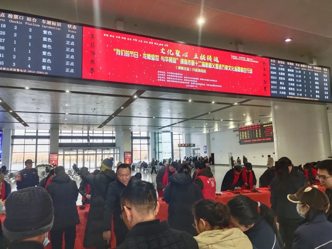收费信息:免费1月26日上午,“文化聚心 立根铸魂——‘我们的节日·龙腾盛世 与华相宜’渭南市第十二届新春义墨进万家文化志愿者在行动”活动在渭南北站候车厅举行,渭南市书法家协会书法创作骨干、市文化艺术中心书法创作干部及青少年文化志愿者共20余名书写人员,为旅客朋友们奉送了节日的祝福和美好的祝愿!
