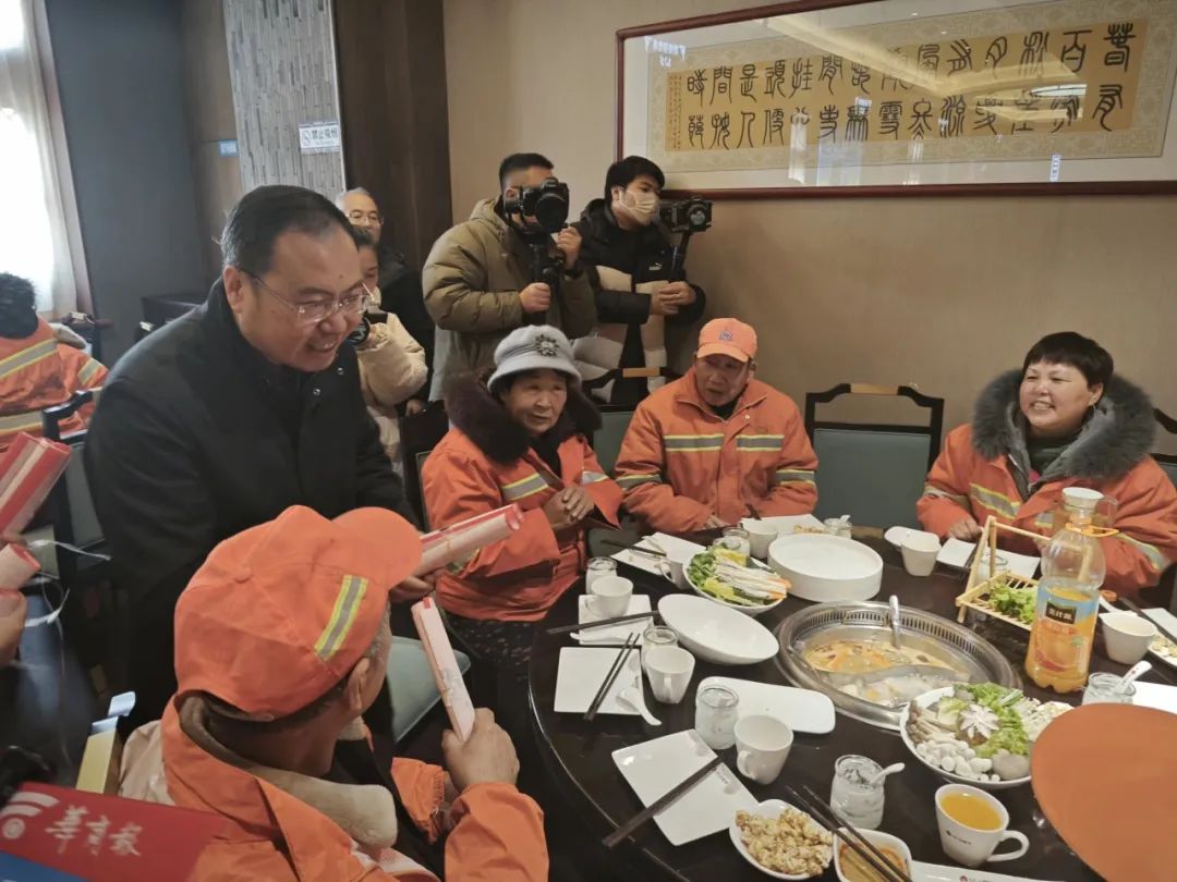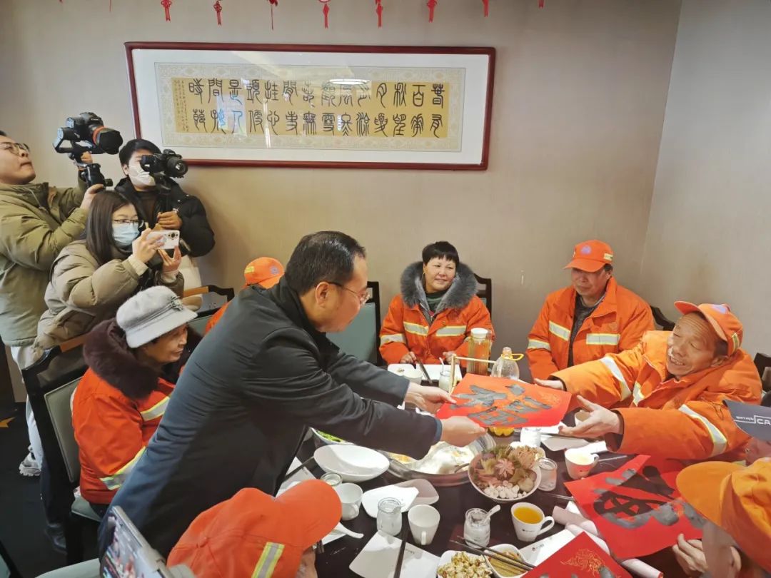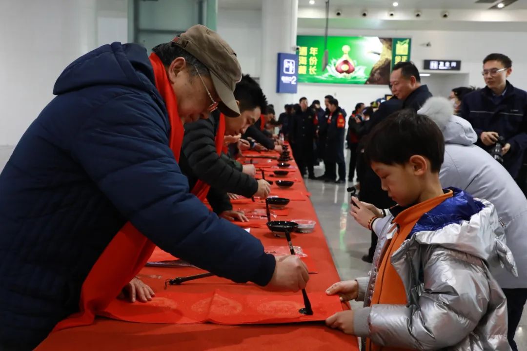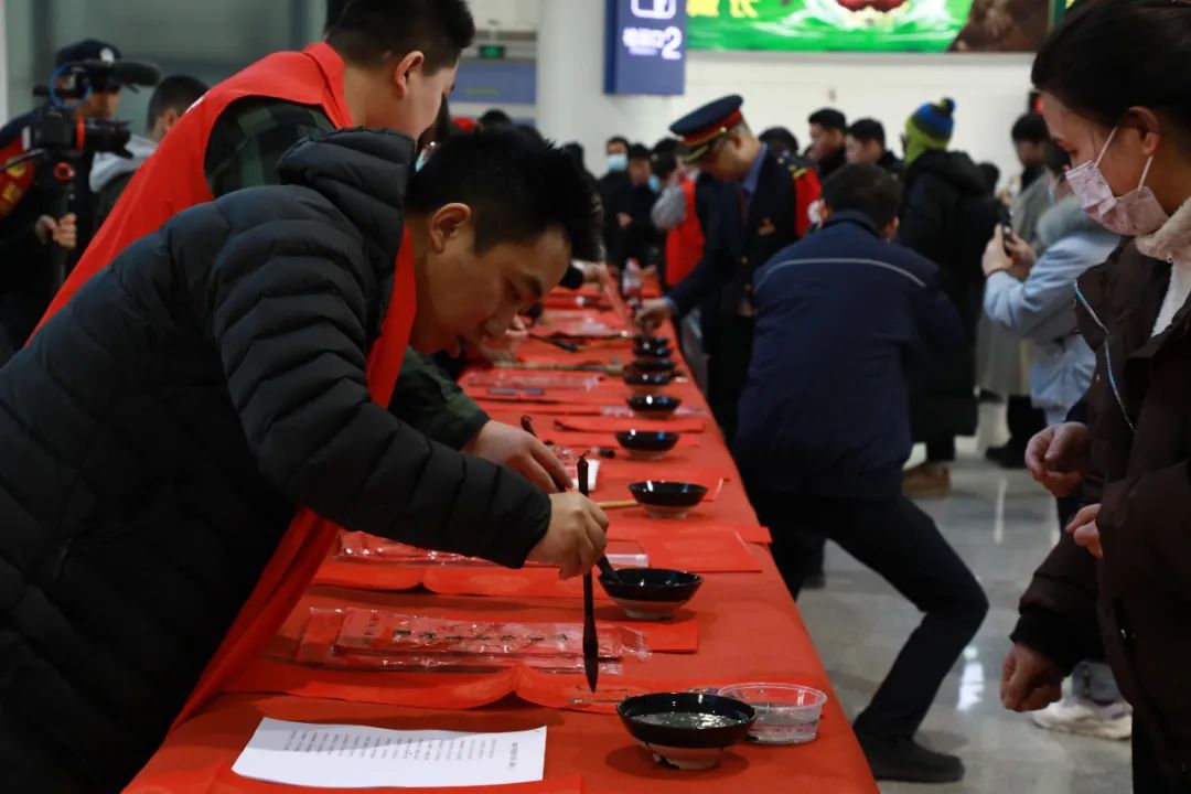 活动期间,文化志愿者挥毫泼墨,一副副红彤彤的春联象征着一份份殷殷的春节祝福,一件件厚重饱满的“福”字意象了浓浓的“年”味乡愁。在近两个小时的时间里,为即将踏上回家归途的乘客书写送出了春联500余副、“福”字100幅,乡音加上乡愁,2024甲辰龙年平添了几许浓郁的春节气息。 文化进万家,欢欢喜喜过大年。春节,既是出发的起点,也是心灵的归宿!我们安排设置“渭南北站分会场”,是故乡欢迎游子的特殊方式,是为在外辛苦工作的乡亲送上春节的祝福,是传递来自家乡父老的殷切关怀和家的温暖,也是对还没有回到故乡的游子的召唤! 同一时间,在渭南城区的另一端,华商报二三里资讯联合爱心企业小尾羊火锅、临渭区环卫中心、渭南市文化艺术中心共同发起“火锅饺子暖意浓——渭南百名环卫工人提前吃年夜饭”活动,渭南市文化艺术中心主任田建参加活动并致辞,感谢环卫工人对城市美容美化做出的贡献,向环卫工人送春联100副、“福”字30幅,让城市的温度升华成为了人情的温度。 春节的大幕已经拉开,渭南市“新春义墨进万家”的活动也在火热开展,将继续为渭南人民做好文化服务,为渭南市公共文化服务高质量发展贡献群文力量。