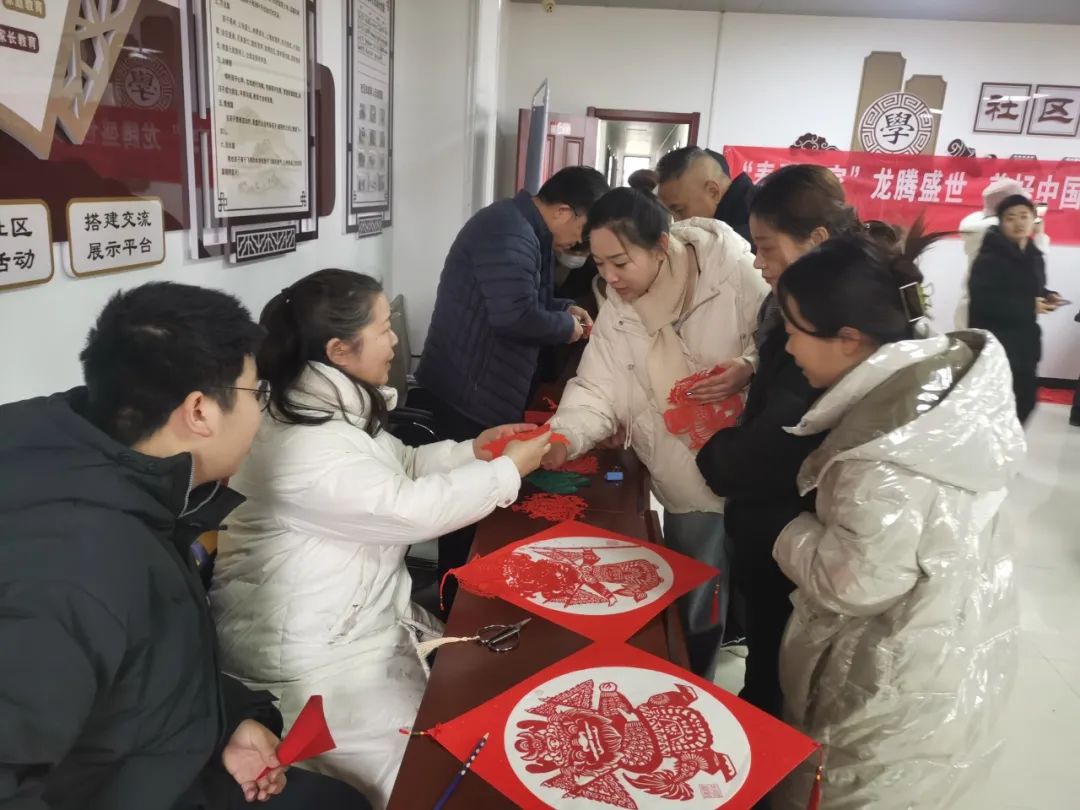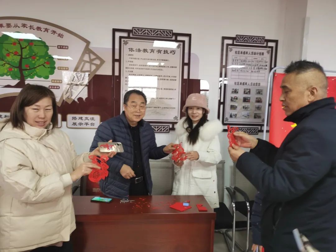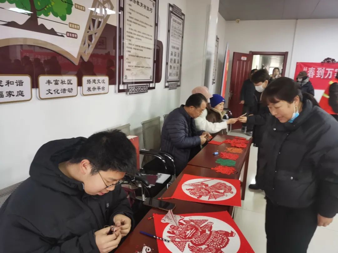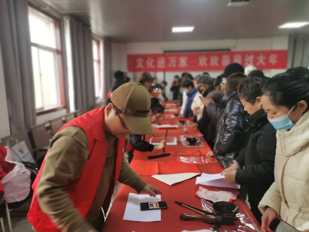 活动现场,大家欢聚一堂。由雷志成、高存梅老师带领大家一起剪窗花,一把剪刀,一折一剪之间雕刻出美好祝福;粗细虚实之间,流淌出无限温情。书法老师们蘸饱笔墨,在红纸上洋洋洒洒,一幅幅寓意吉祥的春联和福字一一挥就。不一会儿带着淡淡墨香和浓浓祝福的一副副新春对联、一个个喜庆福字跃然纸上。本次活动为社区居民分别送出百余幅窗花和春联,用传统文化为群众增添了浓浓的年味。 渭南市文化艺术中心副主任张蕴、中共渭南市临渭区委宣传部副部长,新时代文明实践中心主任吴涛、双王街道党工委副书记王涛、临渭区文化馆馆长钟娟参加活动启动仪式,现场为广大群众送春联。