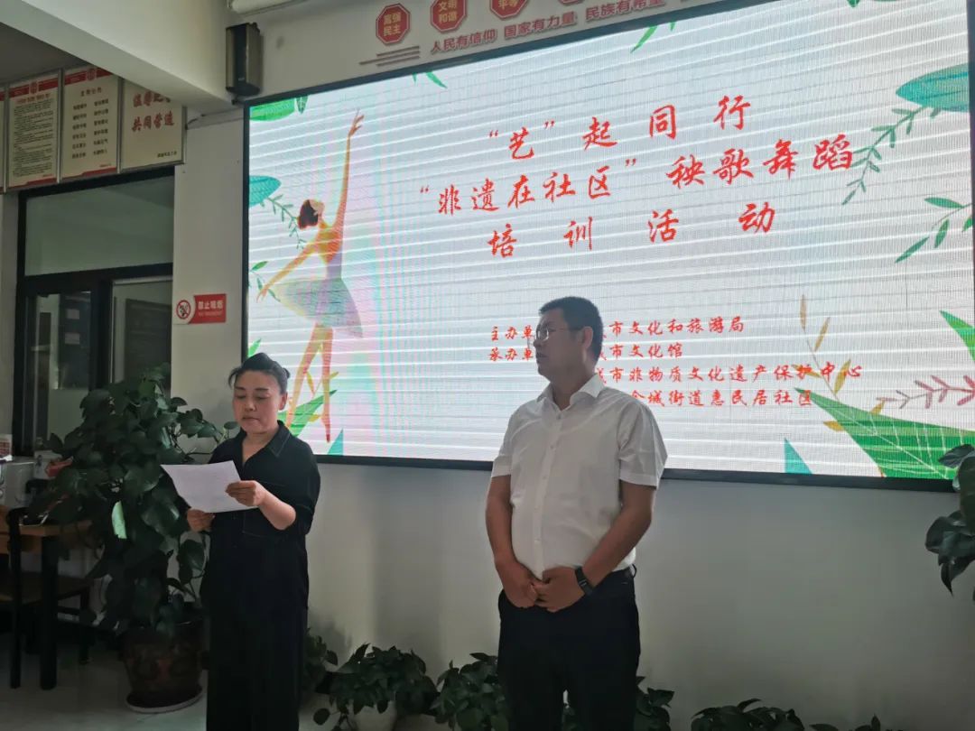 韩城市文化馆副馆长、非物质文化遗产保护中心副主任杨晓燕介绍了“非遗在社区”示范点的基本职能及活动开展基本概况,惠民居社区党支部书记徐志明做开班仪式发言讲话。