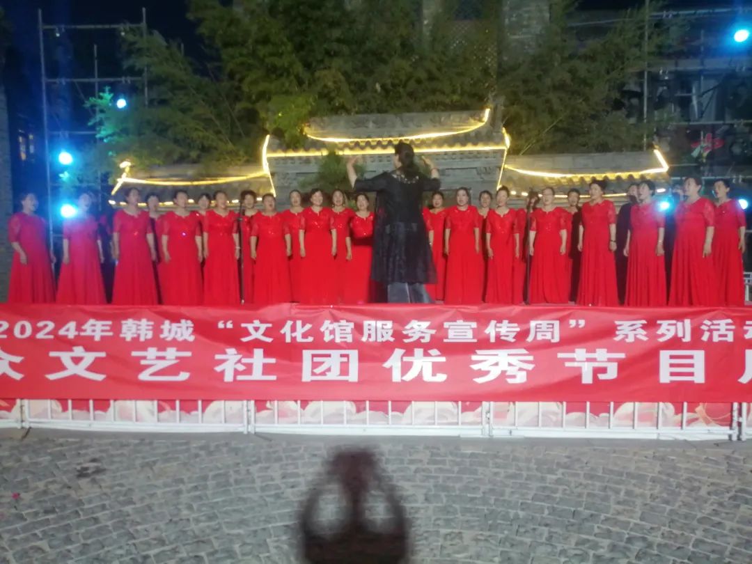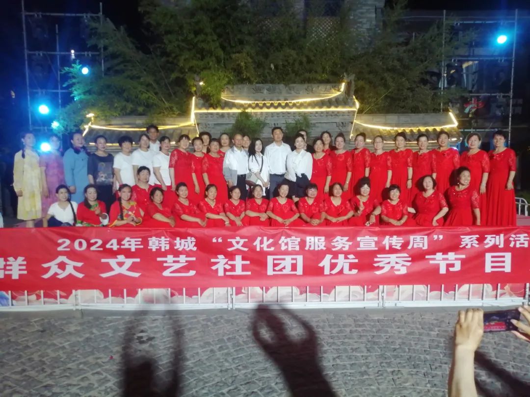 为了不断满足广大人民群众日益增长的多元文化需求,切实增强人民群众文化成果的获得感和幸福感,让文化馆成为人民的终身美育学校,5月20日晚,由陕西省文化馆、中共韩城市委宣传部指导,韩城市文化和旅游局主办,韩城市文化馆承办,陕西文化产业(韩城)投资有限公司协办的2024年韩城“文化馆服务宣传周”群众文艺社团优秀节目展演首场演出在古城文化街区精彩亮相。
