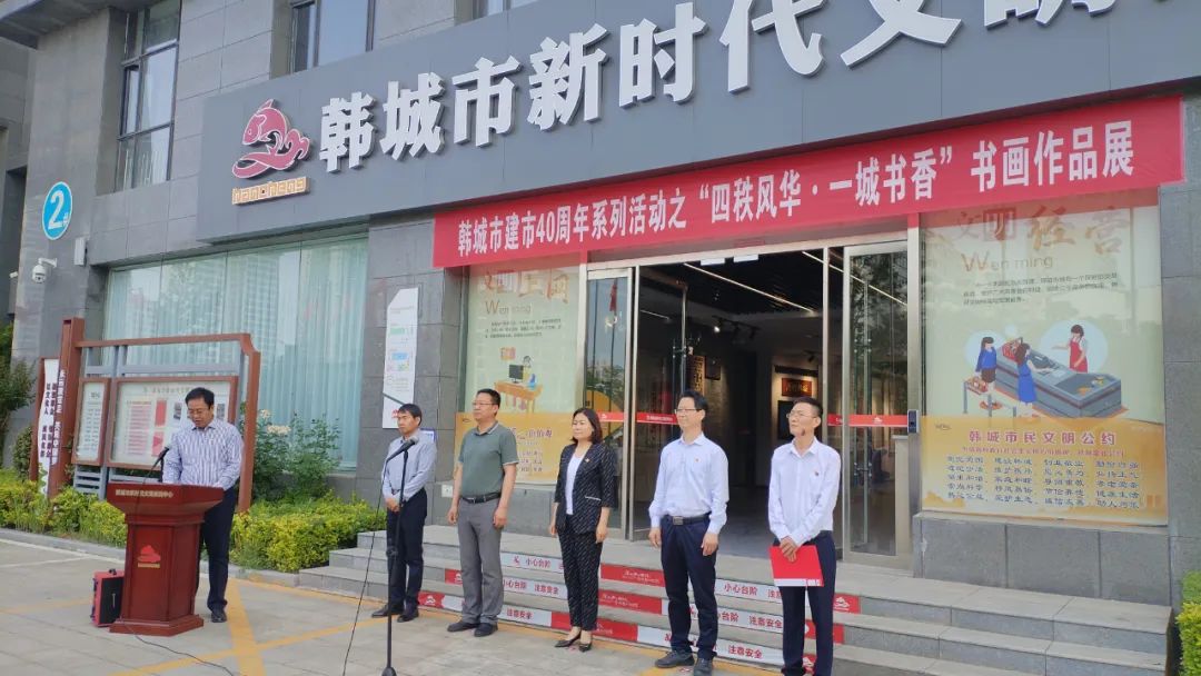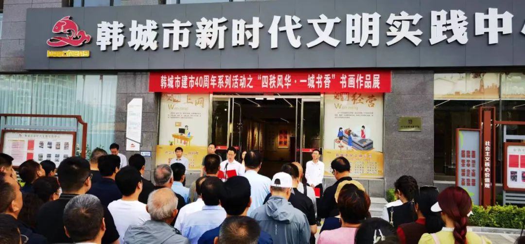 5月11日上午,韩城市建市四十周年系列活动之“四秩风华·一城书香”书画作品展在新时代文明实践中心隆重开展。韩城市委常委、宣传部部长毋晓维、韩城市政协党组副书记、副主席贾耀斌、韩城市政协副主席陈玉振、韩城市委宣传部常务副部长高少武、韩城市文学艺术界联合会主席牛涛 、各部门、各单位分管领导、各协(学)会负责人及参展作者参加此次开展仪式。