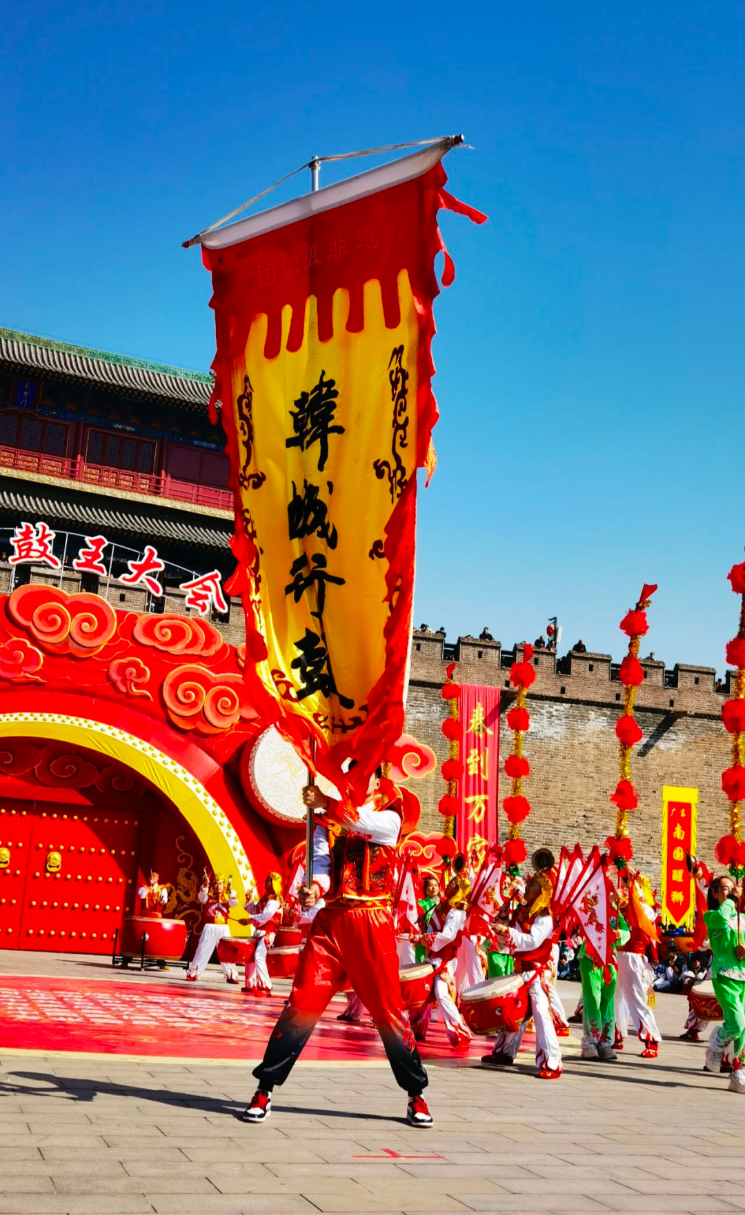 由我馆组织、陕西省韩城市龙门钢铁责任有限公司行鼓队表演的《韩城行鼓》,以其恢弘气势、粗犷豪放、酣畅淋漓的展示,赢得当地群众及古城游客的阵阵喝彩和高度评价。巡演中,队伍屡次被当地群众及外地游客围住,强烈要求表演展示,“韩城行鼓太帅了!”“这个鼓点听着好激昂,太喜欢了!”……围观群众的频频赞美声,不仅是对韩城行鼓的认可,更表达了新时代中国人民对美好生活的热切向往。
