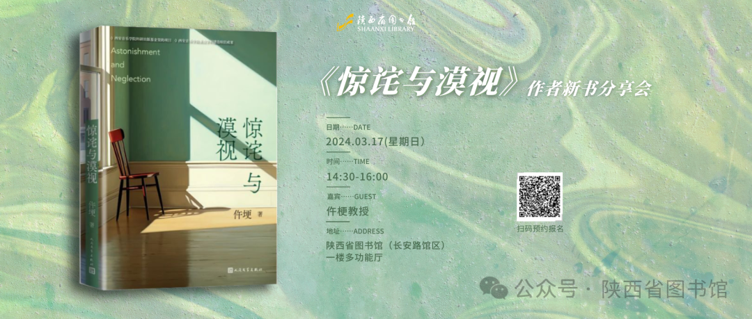 怜悯与良善,总能在我们的心底唤起某种触动。无论遇到何种情况,谁也无法在人心中去除这个根本,任谁也难以抵挡它的力量。它是人心之根,是上天安顿于人心深处的依据,这种天然的向善力量,就是通达文明的不屈不挠的种子,哪怕它在岩石底下,也要奋力地生长出来。怜悯、良知、自由的渴望,它是长在人心深处的,是人之所以为人的依据。 ——仵埂 讲 题 《惊诧与漠视》作者新书分享会 时 间 3月17日(星期日)14:30-16:00 地 点 陕西省图书馆(长安路馆区) 一楼多功能厅 嘉 宾 仵埂教授 请扫描二维码 预约线下活动 《惊诧与漠视》 仵埂 著 人民文学出版社 2023年11月出版 从自我经验出发,与当下的精神文化碰撞 表达时代与生活的困顿、冲突与缠绕 ⋯⋯ ⋯⋯ 记录了时代沧桑巨变在我们生活中的投射 挖掘日常中被忽视的生命异在与文化密码 本书是著名评论家仵埂的最新思想随笔集,收录了他近十年思想随笔写作的精选篇目,以感性形象的表达,展现他对历史文化、社会人生诸多问题的哲学思考。 这部思想随笔分为三个部分,第一部分“谛听天界的那一缕讯息”,回望历史人物,对比中西文化,以睿智的笔触记录了时代沧桑巨变在我们生活中的投射;第二部分“缄默与沉思”,探讨了时代与生活的困顿、冲突与缠绕,是对历史与当下现实的反思;第三部分“惊诧与漠视”,关注个体的特异性,挖掘日常中被忽视的生命异在与文化密码。 作者善于将自己多年的学术积累、艺术感悟和人生体验融汇于文章之中,以轻盈的文字和艺术化的表达呈现了他独到的观察与思索,行文自在,不拘一格。 就随笔散文写作而言,这是我最为满意的一部作品,敝帚自珍吧。自珍者,乃与前相比,这部集子的创作心境,颇为不同。 “文章千古事,得失寸心知。”千古事说不上,寸心知却是真切的。正因寸心生喜,于是尤为自珍。这部集子里的文章,一多半来自我的公众号“幡然之得”。 感谢互联网提供了这个平台,让我有了挥洒张扬自我精神的机会。作为自媒体,文责自负,好坏赖不得别人,也没有人为你承担连带责任。如若文章上报刊,出了错,编辑便也跟着受累。自己为自己负责,一下子没了羁绊,所以写得洒脱且随性。 《惊诧与漠视》 仵埂 著 正因为写得恣意和放纵,真正体验到了写作的快乐。当然,也非绝对的自由,只能在隐约的边界之内自由挥洒。但因其没有了投稿目的之制约,没有了学报体文章的规范要求,没有了职称或课题的压力,没有了核心期刊发表的困窘,真有一种解放的感觉。 既然失去了这如许的功利性目的,那这样的写作到底是为了什么呢?为了吐出结在自己心中的丝来。这些思想之丝,本已长久蕴蓄心中,只待时机成熟,将它吐出就行。 人呐,还有这样一种内在需要,就是通畅地表达内心深处的想法。除了口语,一个人习练了运用文字语言表达自我心境的能力,它生长为内在渴望,压抑它有如伤害。于此我相信,古代那些高悬文字之剑的年代,却总有人冒着生命危险犯禁,他实在是遵从了一个人之为人的自然法则,依从本己之愿,倾吐积郁心情。表达,恰是从自然原则里延伸出来的天赋人权。感谢上天赋予人这种能力,我喜欢运用这个天然权利。 人多有惰性,我也不例外,尽管内心有千丝万缕想吐露,但也须有契机。公众号每期的催促,就是一种达成,最终成就了这一组文章。在我而言,每期交出文章即可。但对公众号的管理者刘晓芳来说,则还有排版、配图、提炼段落等工作,这些都挺费事挺麻烦。她亦有自己的事情,一边读博,一边任教,忙得一塌糊涂。她的热心,也让我懈怠不得。 随笔集分三部分,第二、三部分多为这两年所写公众号文章,第一部分所收录多为《西安晚报》副刊为我开设的专栏文章。这个专栏,大约写了两个月。受报纸篇幅要求所限,文章皆为一二千字的小文。在此要感谢高亚平先生,没有他的美意,也就没有这一批小文章。 写作中,我还获得许多好友无私的支持和鼓励,王宏利先生就是一个。我们是老友,相识相交近三十年了。他知道我搞文艺批评,以他人作品作为研究对象,生发个人观点。批评当然不能天马行空,自说自话,它必须囿于研究对象所及的范围内。因之,宏利先生说:你为什么不写自己的东西?你有那么多思考,写出来多好哇!于人于己都好。他的话触动了我,也激励了我。后来,我每有新文发出,他常与我探讨,说出自己的观感。有时候是肯定和夸赞,有时候与我商榷,提出不同的想法意见,真诚恳切地与我交流讨论,动辄煲电话粥一两个小时。这些,都极大地鼓舞了我,使我在辛劳之余,感到了思想收获的喜悦与甘甜。 本随笔集取名《惊诧与漠视》,借用了目录中一个小标题。意在传达这样一种状态,就是人对日常习见之物,忽然获取的顿悟,仿若天窗打开,让你一下子看到天光云影,这种憬悟带来的神情就是惊诧、讶异,这是突发的开悟之感。本书所收之文,大多是有悟而思,有思而作。许多所得,常令自己惊诧莫名。我深知,一个时代有一个时代命题的打开,亦有这个时代命题的遮蔽,我发现我所憬悟的,在许多思考者那里,多能获得印证或回响。于是,我知道时代的天门打开了,我常因之激动不已。但我也看到,我所惊诧之事变,他人可能熟视无睹。当然,反过来,他人欣欣然之言说,我也可能置若罔闻。人与人是如此不同,所敏感的对象也是迥然有别,但愿我的惊诧能够给漠视者