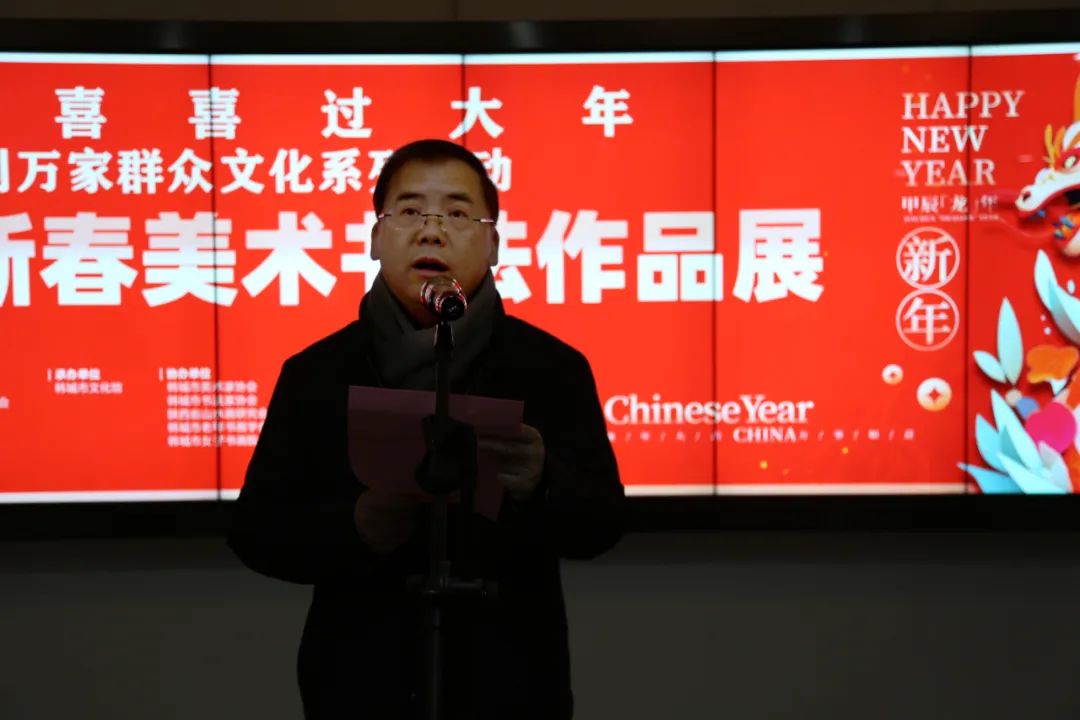 丹青吐彩迎新春,翰墨飘香谱华章。为深入学习宣传贯彻党的二十大精神,着眼于新时代文艺事业健康发展,2月4日上午,由韩城市文化和旅游局、韩城市文学艺术界联合会主办,韩城市文化馆承办,韩城市美术家协会、韩城市书法家协会、陕西省山水画研究会韩城分会、韩城市老年书画学会、韩城市女子书画院协办的“欢欢喜喜过大年”春到万家群众文化系列活动2024迎新春美术书法作品展在韩城市文化馆隆重开展。