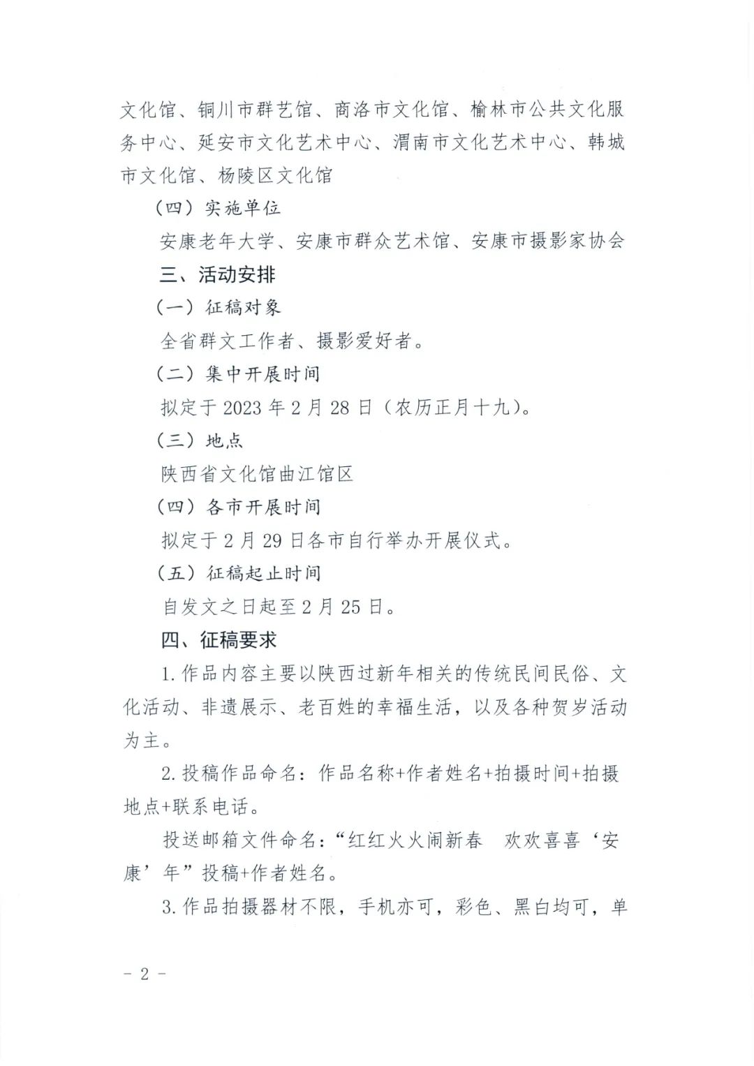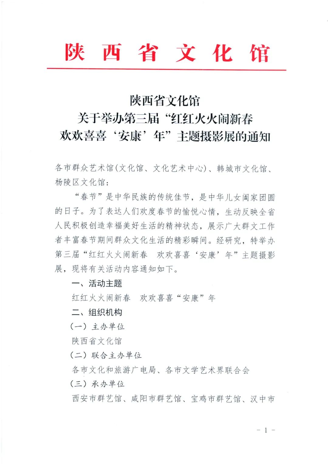 “春节”是中华民族的传统佳节,是中华儿女阖家团圆的日子。为了表达人们欢度春节的愉悦心情,生动反映全省人民积极创造幸福美好生活的精神状态,展示广大群文工作者丰富春节期间群众文化生活的精彩瞬间。根据陕西省文化馆关于《举办第三届“红红火火闹新春 欢欢喜喜‘安康’年”主题摄影作品展》的通知,韩城市文化馆现面向全市开展摄影作品征集工作,现将具体安排通知如下:1.作品内容主要以陕西过新年相关的传统民间民俗、文化活动、非遗展示、老百姓的幸福生活,以及各种贺岁活动为主。2.投稿作品命名:作品名称+作者姓名+拍摄时间+拍摄地点+联系电话。投送邮箱文件命名:“红红火火闹新春 欢欢喜喜‘安康’年”投稿+作者姓名。3.作品拍摄器材不限,手机亦可,彩色、黑白均可,单3.作品拍摄器材不限,手机亦可,彩色、黑白均可,单幅、组照都可投稿(组照按一幅作品计算,每组限4至8张,必须拼图),题材必须符合征集内容的相关要求。4.作品要求JPG格式,长边不低于3000像素,文件大小5MB以上。