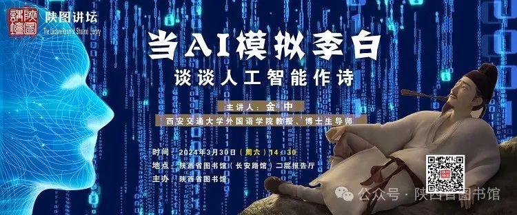 本期讲座,“陕图讲坛”特邀西安交通大学东亭诗社人工智能诗歌创作研发团队指导老师金中教授,介绍人工智能作诗最新研究,揭秘科技密码,畅谈“AI诗人们”的现在、未来。