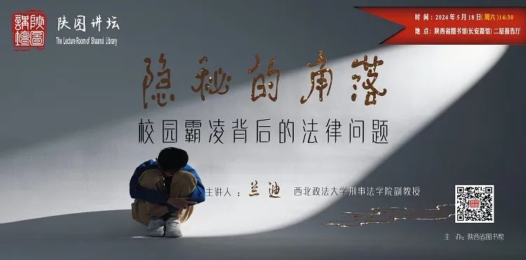 兰迪,男,内蒙古包头人,中国人民大学法学博士,西北政法大学刑事法学院副教授,硕士生导师,兼任西北刑事法律科学研究中心研究员。主持国家社科基金项目一部,主持、参与省部级以上科研项目多部,发表学术论文数十篇,出版专著两部。主要研究方向为刑法学、犯罪学。校园霸凌是青少年成长道路上的一道坎,长期困扰青少年及其家庭。这道坎是否能够顺利迈过,可能会深度影响青少年的一生,至关重要。近年来,涉及校园霸凌的法治案件层出不穷,引发社会关注。那么,“校园霸陵”如何界定?面对有形和无形的伤害,受害者怎样自救、保护自身权利?施暴者需要承担的法律后果?学校和社会的责任是?…… 本期讲座,“陕图讲坛”特邀西北政法大学刑事法学院兰迪副教授,将深度解读“校园霸凌”背后的法律问题,教您用法律武器,预防、应对校园霸凌。