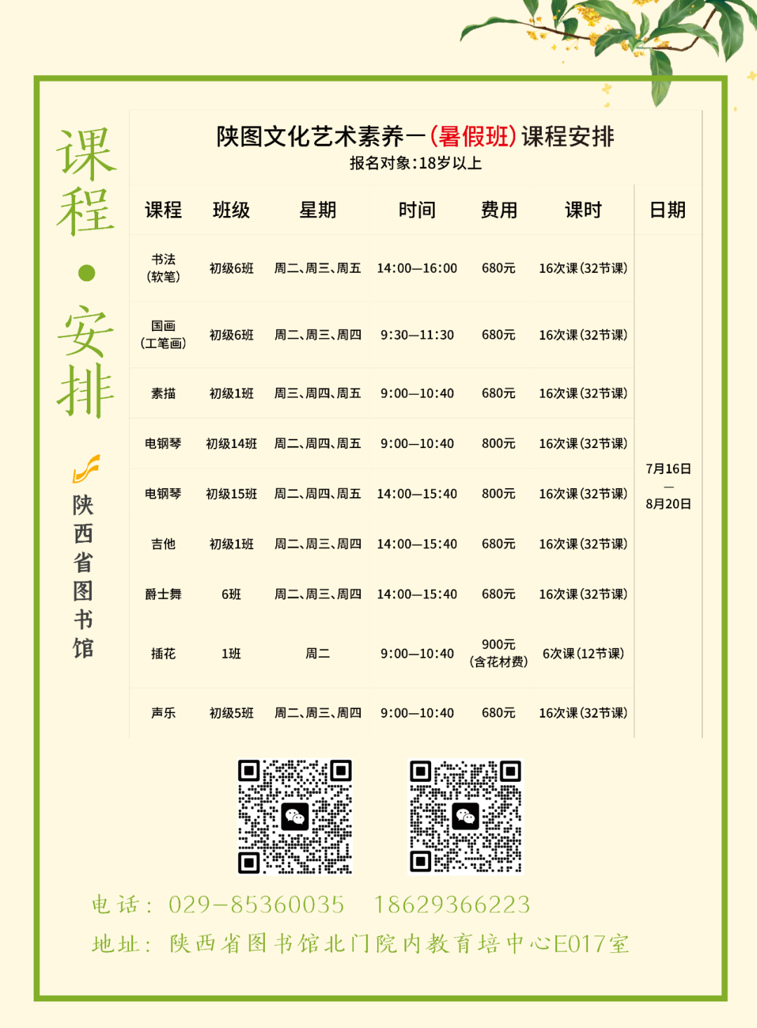 欢迎参加陕西省图书馆【文化艺术素养提升】学习,培养文化自信,提升艺术修养,让文化艺术融入每个人的生活。 1、学员性别不限; 2、年龄要求:18岁以上(爵士舞年龄在45岁以内); 3、身体健康,具有完全行为能力,能自主学习; 1、可现场报名(陕西省图书馆长安路馆区北门院内教育培训中心E016、E017室) 2、微信报名 3、电话咨询: 18629366223沈老师,029-85360035张老师