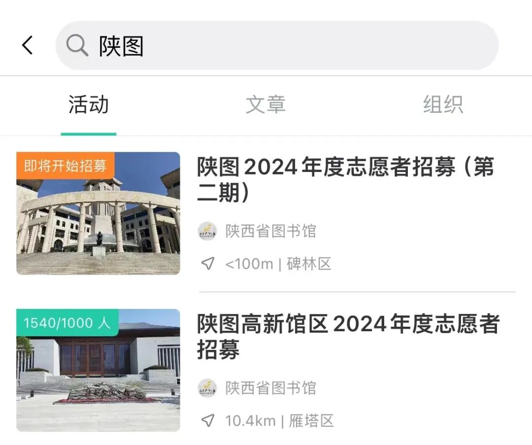 01 报名时间 2024年6月24日-2024年7月31日 02 活动内容 整书上架、活动协助、档案整理、秩序维持、阅读推广等 03 志愿服务时间 周二至周天,上午9:00-12:00;下午14:00-17:00(可根据自己时间选择一天或半天) 01 报名要求 1、申请本活动需满足16-60周岁、身心健康的基本条件 2、注重个人仪容仪表,服务时遵守陕图安排,对读者文明礼貌 3、如需开具社会实践证明需达到服务时长40小时 02 报名方式 下载“志愿汇”APP,首页“找活动”板块中搜关键词“陕图”,可搜索到两个馆区(长安路馆区、高新馆区)的两个招募活动(搜索时确保左上角定位在西安市),可自行选择馆区进行报名,内附有详细的招募要求。 报名后工作人员在后台进行审核,审核结果一般会在1-5个工作日(节假日除外)公布在报名页面中。 温馨提示:点击报名招募活动即可,无需点击加入组织。 审核通过后,请本人于报名起一个月内携本人有效身份证件,到所报名馆区办理复核等手续,领取个人志愿考勤表。闭馆、午休时间以及周末不进行复核工作。复核后才可开始正式志愿服务。 03 复核位置 长安路馆区复核位置: 一楼志愿者服务站(借阅一区进门后右转) 咨询电话029-85397598 傅老师 高新馆区复核位置: 二楼东侧服务台 咨询电话029-88629100 贾老师 陕图兰台志愿者部分志愿服务风采回顾