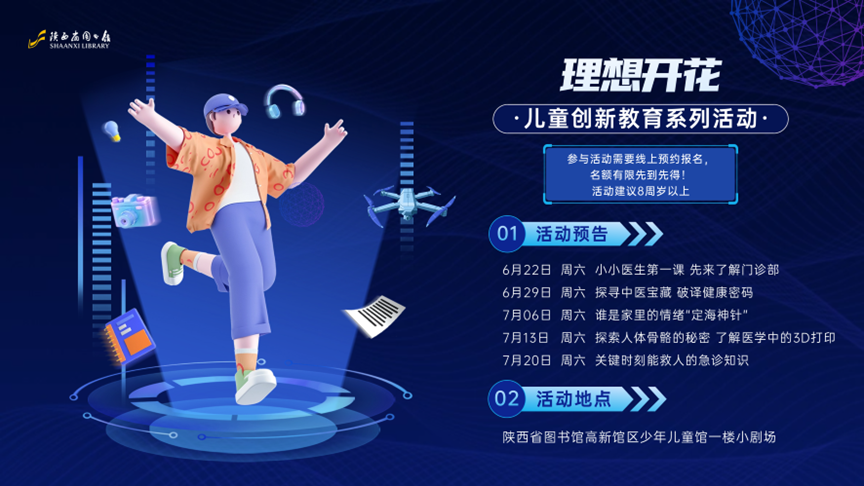 “理想开花”为陕西省图书馆高新馆区儿童创新教育系列活动品牌,旨在为孩子们搭建兴趣培养的平台,拓宽视野,了解前沿科技,体验不同的职业领域、培养学习兴趣,锻造创新精神。