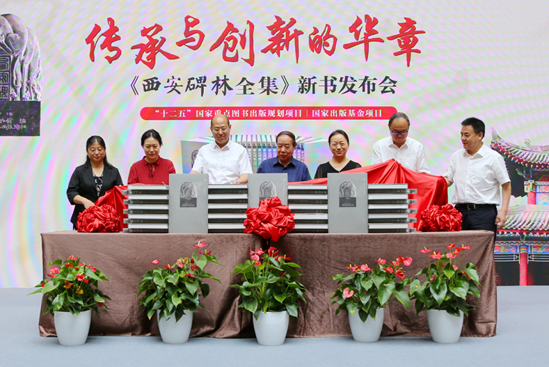 活动现场,贾平凹、张松柳、王金青、李磊、周云岳、周萍、张红春一起上台为《西安碑林全集》揭幕。