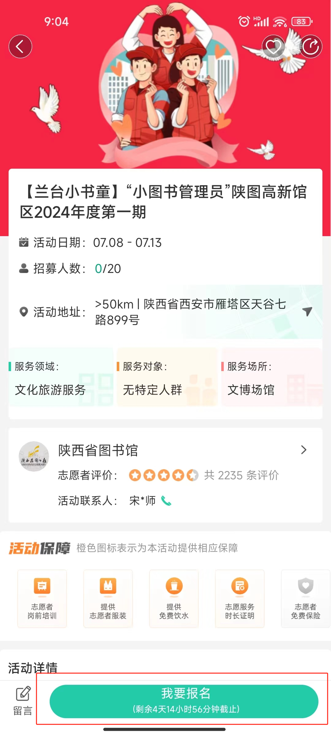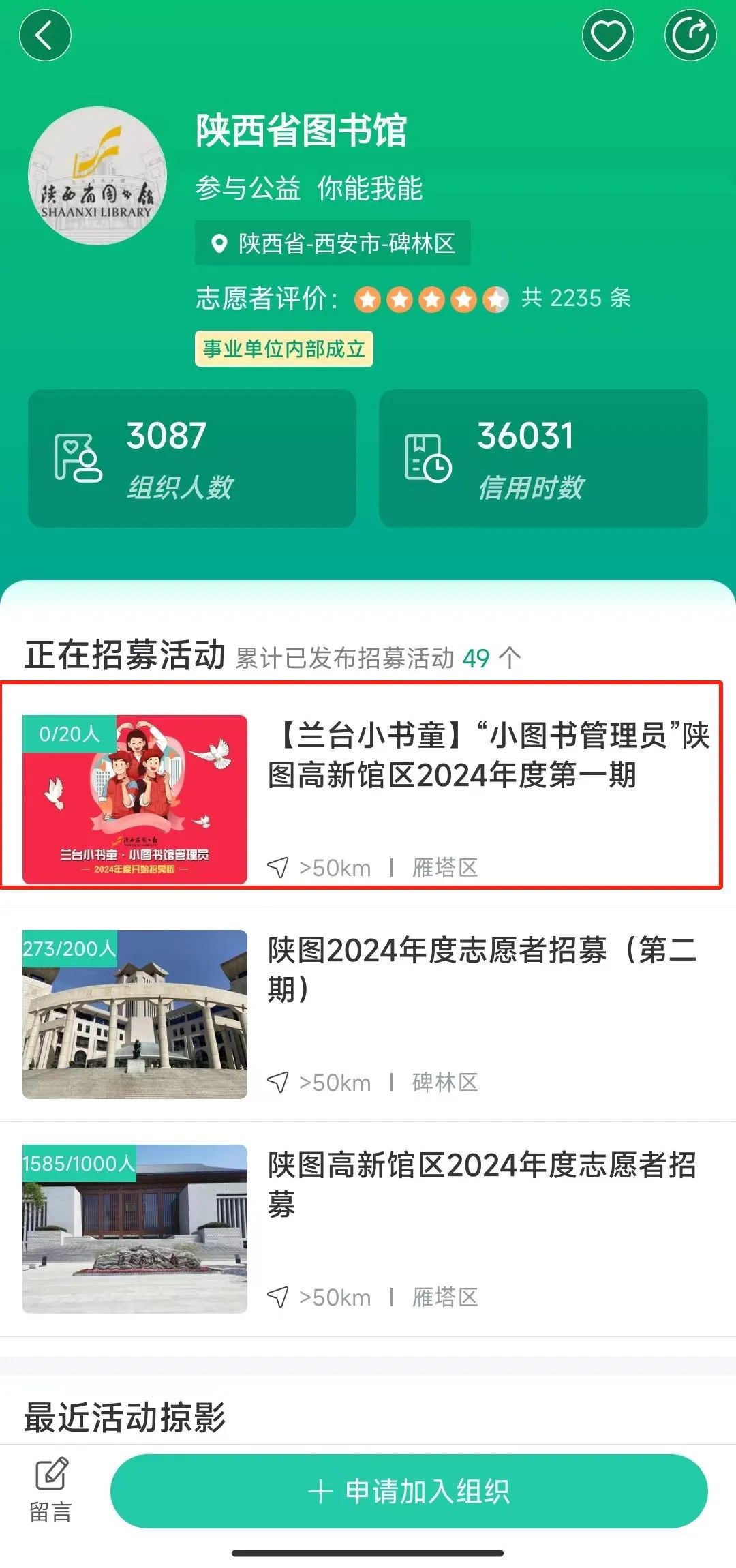 招募对象 10-16岁少年儿童(2008年-2014年内出生) 招募人数 20人 招募时间 2024年7月1日-7月5日 (若报名人数超出预计,会提前关闭报名通道) 活动时间 2024年7月8日-7月13日(共计6天) 工作内容 熟悉图书分类; 分类整理图书; 负责本区域巡视; 负责阅览区的纪律管理; 回答读者咨询和其他辅助工作; 规劝不文明行为。 工作地点 陕西省图书馆高新馆区 报名须知 小读者需自愿参与本活动; 小读者身体健康,品行端正,具备一定独立能力; 小读者能遵守陕西省图书馆规章制度,若出现违反图书馆制度、不能很好地约束自己行为的,将被终止“小图书管理员”身份; 具备志愿服务岗位必备的文明素质; 家长能够负责接送,做好往返途中安全防护; 每日按时签到签退,不允许无故出现迟到早退情况,特殊情况需家长提前联系工作人员; 工作期间不得携带手机、iPad等贵重电子设备; 活动最终解释权归陕西省图书馆所有。 注意事项 请使用孩子本人的身份信息在“志愿汇”APP平台注册报名。(具体报名形式详见下文) 报名后,工作人员会按照报名先后顺序与符合条件的孩子家长电话确认信息。(三次电话未接通,则视为放弃报名) 如果孩子不能按时参与,请勿确认报名,将名额留给需要的孩子。 为了保证孩子的安全,家长不能按时接送的情况请勿报名。 报名方式 请参与者通过志愿汇APP进行报名; 报名流程如下: “志愿汇”平台是“志愿中国”信息系统的移动应用端,是在共青团中央、国家发展和改革委员会、民政部指导下建设运营的全国领先的志愿服务应用平台。 1、下载志愿汇APP,进行注册。 2、注册信息填写参与活动的孩子姓名、身份证号码、所在地信息。 3、注册完成后进入APP主页,点击搜索。 4、搜索陕西省图书馆,选择组织。 5、进入陕西省图书馆界面,点击【兰台小书童】“小图书管理员”陕图高新馆区2024第一期。 6、进入活动界面点击我要报名即可参与活动,等待审核。