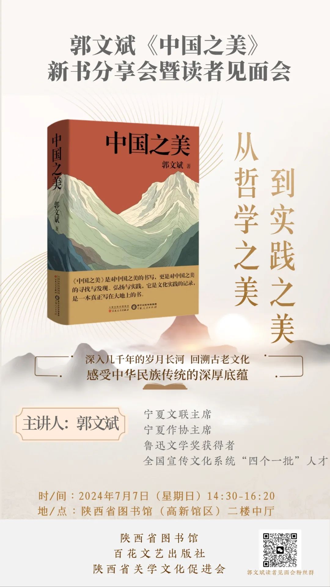 古人晴耕雨读的生活方式智慧,使他们活在一种耕读的诗意里,活在农事诗的狂欢里。 —— 郭文斌 7月7日,陕西省图书馆联合百花文艺出版社、陕西省关学文化促进会特邀宁夏文联主席、宁夏作协主席、鲁迅文学奖获得者郭文斌先生与读者分享其最新散文集《中国之美》。 从哲学之美到实践之美,我们邀请亲爱的读者朋友们跟随作家一同感受“一本真正写在大地上的书”,来寻找中国之美、发现中国之美、爱上中国之美。 《中国之美》由百花文艺出版社和宁夏人民出版社联合出版。作品展示了中国乡土生活中风俗的多姿多彩,梳理了风俗之所以形成的自然与社会基础,赞美了中华民族的伟大精神和源远流长的文化传承,语言简单平实,内容直指精神与心灵,闪烁着诗意的灵光,通过对古老文化传统的回溯,将读者带入几千年的岁月长河,感受中华民族传统的深厚底蕴。 活动主题 从哲学之美到实践之美: 郭文斌《中国之美》新书分享会暨读者见面会 活动时间: 7月7日(周日)14:30—16:20 活动地点: 陕西省图书馆高新馆区二楼中厅 主办单位: 陕西省图书馆(陕西省古籍保护中心) 百花文艺出版社 陕西省关学文化促进会 报名人数: 100人(一人一名额) 报名方式: (请扫描以上二维码报名) 主讲嘉宾: 郭文斌,宁夏文联主席、宁夏作协主席、宁夏回族自治区文化文史和学习委员会副主任、鲁迅文学奖获得者、全国宣传文化系统“四个一批”人才、宁夏回族自治区“60年感动宁夏人物”、宁夏回族自治区文化文史和学习委员会副主任、宁夏回族自治区党委和政府授予“塞上英才”称号。 长篇小说《农历》获第八届茅盾文学奖提名,在最后一轮投票中名列第七。短篇小说《吉祥如意》先后获人民文学奖、小说选刊奖、鲁迅文学奖,短篇小说《冬至》获“北京文学奖”,散文《永远的堡子》获“冰心散文奖”,散文《腊月,怀念一种花》等被收进《百年中国经典散文》,被央视国际频道推荐为“影响过我的文章”。著有畅销书《寻找安详》《醒来》《中国之中》等十余部。有短篇和散文进入中国小说学会、中国散文学会等多家排行榜,选入多家全国性年选本。有部分作品被译成外文。