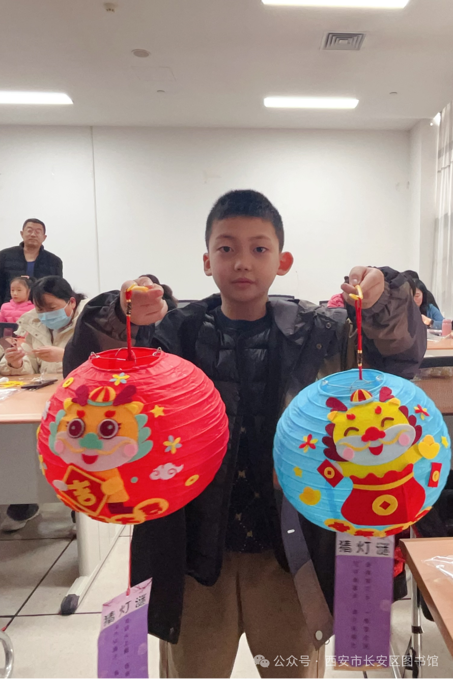收费信息:免费元 传统节日 宵 阖家幸福 平安喜乐 “正月里来正月正,正月十五挂花灯”。元宵节,又称上元节、元夕或灯节,元宵节是中国的传统节日之一。闹花灯是元宵节的重要组成部分,灯笼不但烘托出节日的喜庆氛围,还寄托了人们对团圆、平安、健康的期盼。2024年2月16日在长安区图书馆开展了一场主题为“艺润童年·悦趣元宵”的少儿龙年灯笼DIY手工活动,共有20组亲子家庭参加了本次活动。 活动一开始,老师给大家讲解关于“元宵节”的相关知识,元宵节的来历及传统习俗:吃元宵、猜灯谜、闹花灯、踩高跷、舞狮子、走百病等。老师和小朋友们一边互动,一边讲解,加深了小朋友们对传统节日“元宵节”的认识。 最开心的环节要数“猜灯谜”了,小朋友一个个把手举得高高的,争抢着要回答,老师特意准备了小礼品鼓励小朋友,大家都开动小脑筋积极回答,脸上绽放着自豪、开心的花朵。 经过一个小时左右的不懈努力,一个个漂亮的灯笼呈现在大家眼前。红的、黄的、蓝的,颜色鲜亮,带着“龙年吉祥”、“龙行大运”、“龙年大吉”的祝福,孩子们看着自己的作品,脸上洋溢着幸福的笑容。 小小灯笼,传递着一份美好的祝福,更承载着一份厚重的传统文化。通过此次亲子活动,不仅让孩子们了解中国的传统文化魅力,锻炼了孩子的动手能力,专心细致的品格,提高了审美素养,还促进了家长与孩子之间的情感交流,增进了亲子感情。一盏盏灯笼,凝聚着智慧,闪耀着祝福。 值此新春之际长安区图书馆也祝愿广大读者“龙腾四海,乘风破浪,大展宏图,幸福美满”。