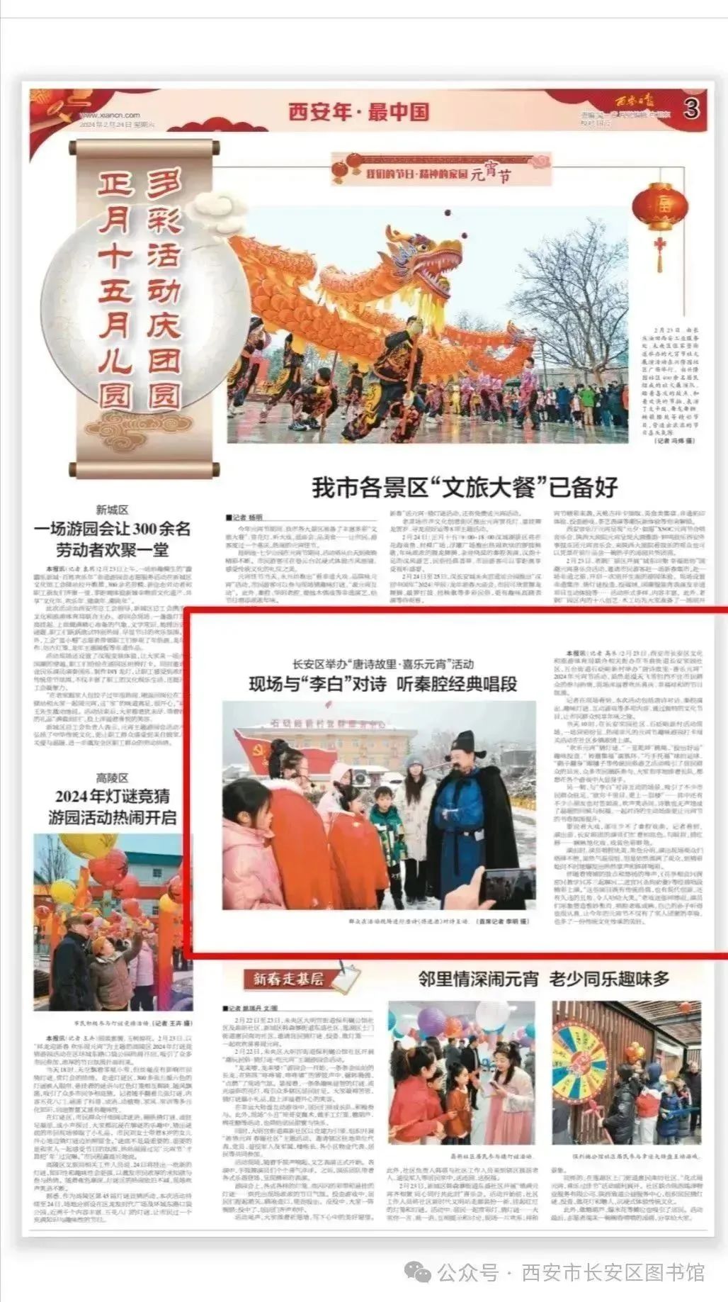 转圈集福”滚铁环、“巧手托福”球拍运球、“鹞子翻身”踢毽子……等传统民俗游艺活动吸引了居民群众的目光,众多市民踊跃参与,大家有序的排着长队,都焦急的想在各个游戏中大显身手。不一会兑奖处人山人海,个个手持通关文牒迫不及待的想要兑现自己的“战利品”,在丰富多彩的活动中尽享元宵节日的快乐,潜移默化的给市民群众普及传统节日文化,弘扬中华民族传统文化,拉满文明、和谐、友善的元宵节氛围! 长安“喊”你来对诗!嘹(的)滴太 “黄河之水天上来,奔流到海不复回!”“将进酒,杯莫停……”从诗仙“李白”踏入元宵欢乐会开始,唐诗之韵便“穿越”时空,闲情雅致中,别有唐风古韵。“李白”对诗互动的场景,吸引了不少市民群众驻足,“欲穷千里目,更上一层楼”“白日依山尽——”“黄河入海流”……其中还有不少小朋友也对答如流,欢声笑语间,诗歌也无声地成了温暖的问候与祝福,一起对诗的生动场面更让长安元宵的书香氛围提升,人们都能感受到这份浪漫情怀,感受着“元夕诗悦长安”的韵味,翘首以待只为对吟一首。从孩提时便刻进记忆里的朗朗上口的唐诗唤醒对长安、对千年中华文明与自己息息相关的同频感受。“仰天大笑出门去,我辈岂是蓬蒿人”;“大鹏一日同风起,扶摇直上九万里”,一首首唐诗不再是书中的寥寥几行,而是大唐长安历历在目的故事与历史,渗透进这座城市的每一隅。来长安对诗,和“李白”邂逅,让观众跟随李白的脚步乘风吟诗,目光所及,既看见古之长安,也领略到了如今璀璨的诗意长安,长安人的文化日常就这样呼之欲出。“五花马,千金裘。呼儿将出换美酒,与尔同销万古愁”,众人齐诵《将进酒》,领略盛唐豪情这一刻心潮起伏、泪湿衣襟。星河轮转,时光千载,充满文化内蕴的古诗词,穿过岁月,在今天再一次击中了人们的心灵,新一代后生与李白吟诗作对,尽显中国人刻在骨子里的文化基因,嘹的太! 过大年看大戏 秦腔戏曲贺新春 “过大年,看大戏”,正月十四轮番上演的精彩戏曲剧目与传统佳节撞个满怀,让今年的元宵节不仅有了家人团聚的幸福,也多了一份传统文化氤氲的美好。演出前,长安剧团演员们忙着拍底色、勾眼眉、描红唇……娴熟的化妆,戏装色彩鲜艳;演出时,演员唱腔优美,角色分明。演出现场观众们络绎不绝,座无虚席,伴随着铿锵的鼓点和悠扬的琴声,《花亭相会》《探窑》《教学》《苏三起解》《二进宫》《杀狗劝妻》等经典唱段精彩上演,这些剧目既有传统经典,也有现代创新,这种传统与现代的完美结合,让观众们陶醉其中,流连忘返,充分领略戏曲艺术的博大精深。演员们更是各个扮相俊俏,形象塑造惟妙惟肖,唱腔老练成熟,韵味十足,将各自的角色演绎得淋漓尽致,观众济济一堂、看得仔细、听得入迷,到精彩处时不时地爆发出热烈掌声和阵阵喝彩。戏曲艺术突显传统文化的独特魅力,秦腔是长安当地老百姓茶余饭后的精神食粮,一声秦腔,一台秦戏,一缕秦情,原汁原味的戏曲表演,更增强了群众的节日幸福感和获得感,浓厚年味弥漫在清甜的空气中。 · END· 相关推荐 西安新闻网报道 中央广电总台国际在线报道 中国网报道 静美五台报道 新华网报道 中国旅游网报道 华商报报道 今朝长安报道 西安发布报道 今朝长安报道
