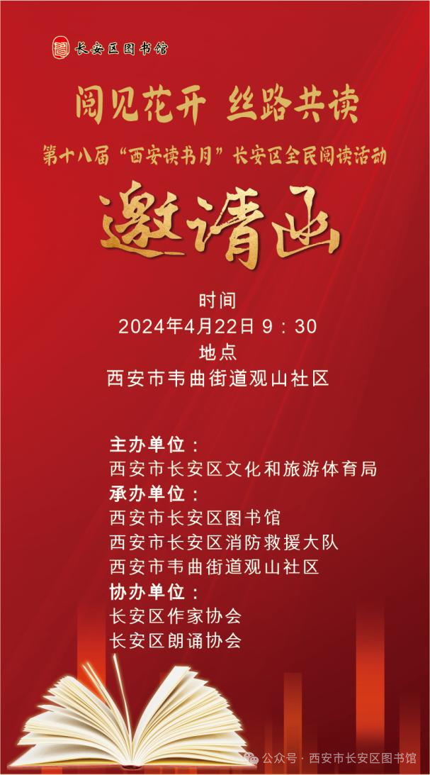 收费信息:免费第十八届西安读书月 长安区全民阅读活动启动仪式 暨主题活动 邀请函 “世界读书日” 爱读书 / 读好书 / 善读书 2024 相约全民阅读节 READING 为贯彻落实党的二十大和习近平总书记致首届全民阅读大会贺信精神,推进全民阅读新风尚,建设书香长安,在第29个“世界读书日”来临之际,西安市长安区文化和旅游体育局组织举办“阅见花开 丝路共读”2024年第十八届“西安读书月”西安市长安区全民阅读活动。 时间:4月22日(周一)9:30 地点:西安市韦曲街道观山社区 (地址:雁塔南路与航天大道西北角4层 联系电话:(029)85891359) 活动内容 暖场节目:乐器演奏表演 第一项:领导致辞 第二项:《长安区特色文化资源库》策划设计相关人员介绍此数字资源的应用及文旅融合意义。 第三项:为2023年优秀读者颁奖 第四项:宣布“阅见花开 丝路共读”2024年西安市长安区全民阅读活动启动 第五项:朗诵表演 第六项:最是书香能致远集体诵读 人间四月,春日烂漫,书香漫溢 翻动书页去邂逅这世间美好 让朝夕之间都有墨香阵阵 春色恰如许,正是读书时 一场关于阅读的约会 诚挚邀请您的莅临