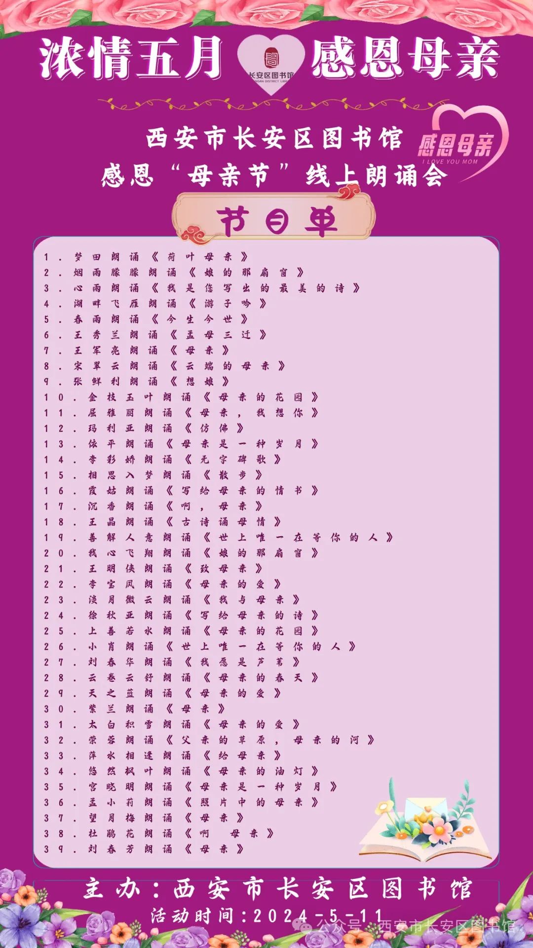 感恩母亲”线上朗诵会如期浓情上演,我们以线上朗诵的方式,汇聚四面八方的声音,共同为我们的母亲献上最深情的祝福与感恩。多位优秀朗诵者,用他们富有感染力的声音,诠释对母亲的感恩之情。他们用真挚的情感,为我们诵读那些关于母爱、关于感恩的经典篇章,这些文字将带领我们走进母爱的世界,感受那份深沉而伟大的爱,让爱与感恩的旋律,穿越时空,传递给每一位伟大的母亲,愿所有的母亲们,都能感受到这份特别的关爱与祝福,让我们用爱和感恩之心,去珍惜和拥抱我们生命中最伟大的母爱。