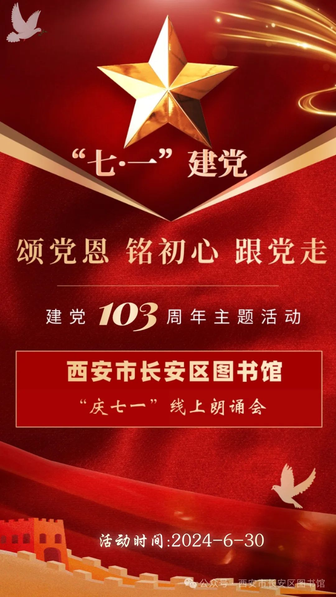 跟党走”庆七一线上朗诵会,来自长图朗诵群的40位朗诵爱好者“以诗言志、以诵传情”,满怀对中国共产党波澜壮阔奋斗历程的自豪感、对党的热爱和感恩之情、对祖国美好未来的坚定信心和美好憧憬,将贯穿百年的红色精神以声音传递,让红色基因根植每位听众心间。朗诵者激情昂扬、深情饱满、用情真挚,表达出中华儿女的永恒信念、坚定力量和中华民族自强不息的精神。整场活动气氛热烈,主题鲜明。 百年岁月峥嵘,百年初心如磐。中国共产党成立103周年,领导中国人民取得了举世瞩目的辉煌成就,书写了波澜壮阔的历史画卷。朗诵会上,诵友们以《红船,从南湖起航》《党旗》《中国,七月的阳光》《七一,党旗飘扬》《党旗颂》《建党节放歌》等为代表作品,一首首声情并茂的吟诵,一篇篇激励奋进的诗作,让我们热血澎湃充满敬仰。 本次线上朗诵会,倾诉对中国共产党的崇敬和热爱之情,讴歌党的恢宏历史与革命先辈的不朽精神,唱响时代旋律,传承红色基因,赓续精神血脉,珍惜来之不易的和平环境,从党的光辉历史中汲取砥砺奋进的精神力量,与党同心,与党同行。 祝愿伟大的中国共产党 生日快乐! 祝愿伟大的祖国繁荣昌盛! 请扫码收听线上朗诵 ★