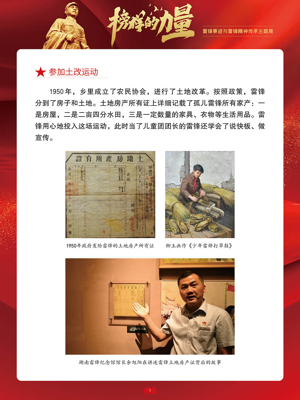 “榜样的力量——雷锋事迹与雷锋精神传承主题展”通过介绍雷锋事迹和新时代的雷锋故事,展示雷锋精神的传承与发扬,旨在使大众深刻了解雷锋精神,做社会主义核心价值观的生动践行者。