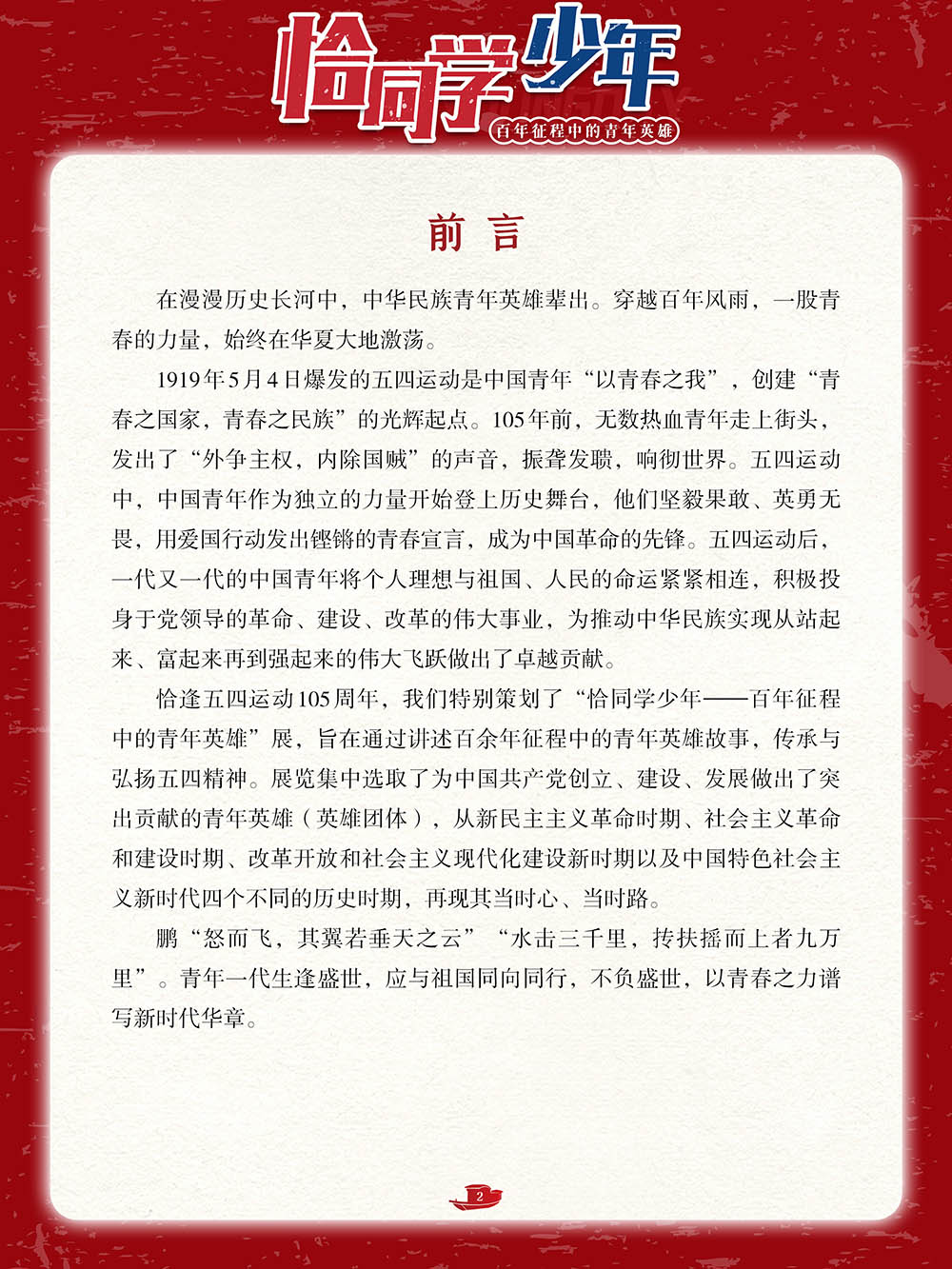 恰逢五四运动105 周年,我们特别策划了“恰同学少年—百年征程中的青年英雄”展,旨在通过讲述百余年征程中的青年英雄故事,传承与弘扬五四精神。展览集中选取了为中国共产党创立、建设、发展做出了突出贡献的青年英雄(英雄团体),从新民主主义革命时期、社会主义革命和建设时期、改革开放和社会主义现代化建设新时期以及中国特色社会主义新时代四个不同的历史时期,再现其当时心、当时路。