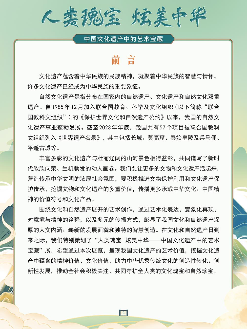在文化和自然遗产日到来之际,我们特别策划了“人类瑰宝 炫美中华——中国文化遗产中的艺术宝藏”展,希望通过本次展览,呈现我国文化遗产的艺术价值,挖掘文化遗产中蕴含的精神价值、文化价值,助力中华优秀传统文化的创造性转化、创新性发展,推动全社会积极关注、共同守护全人类的文化瑰宝和自然珍宝。