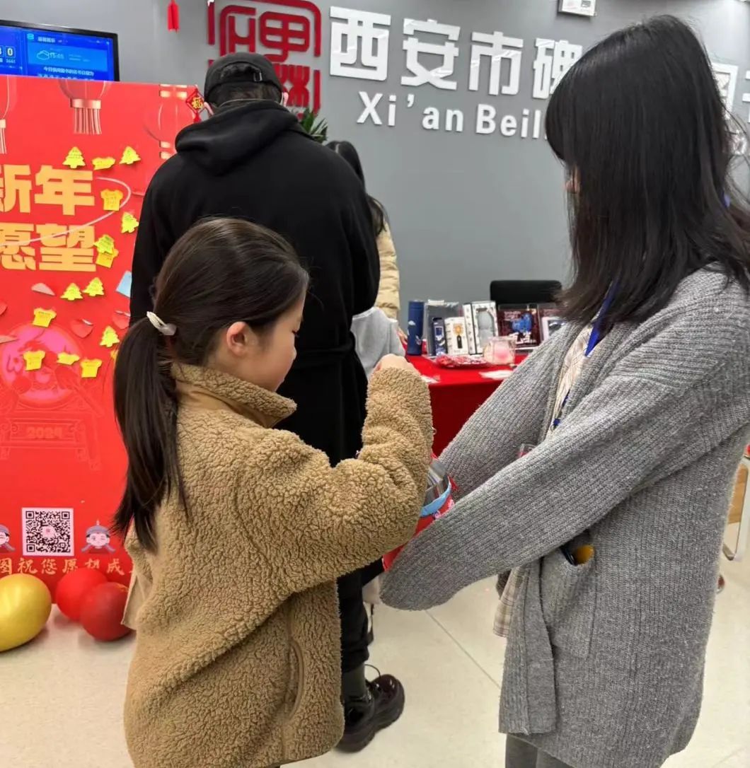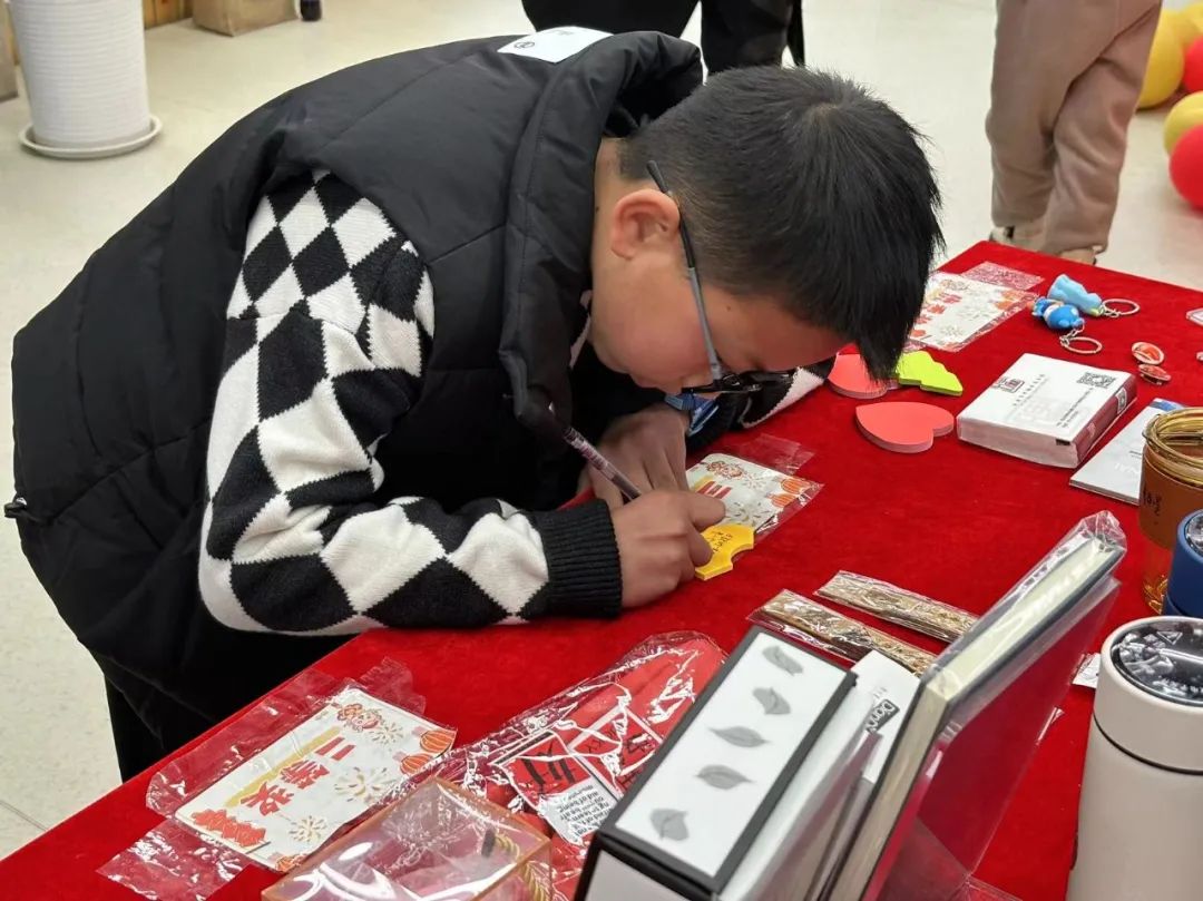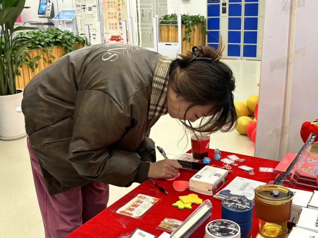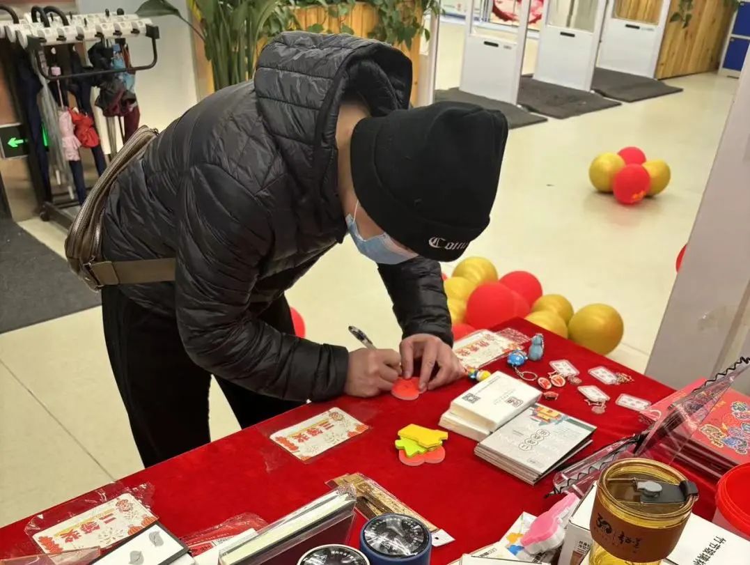 完成借阅书籍、写下新年愿望、与碑小图合影三项内容的读者都获得了抽奖机会。火红的台面上摆着数百个令人应接不暇的丰富好礼,碑图瓦当盏托文创、保温杯、笔记本、书签、小夜灯……让参与的读者们更添了一份欣喜与期待。